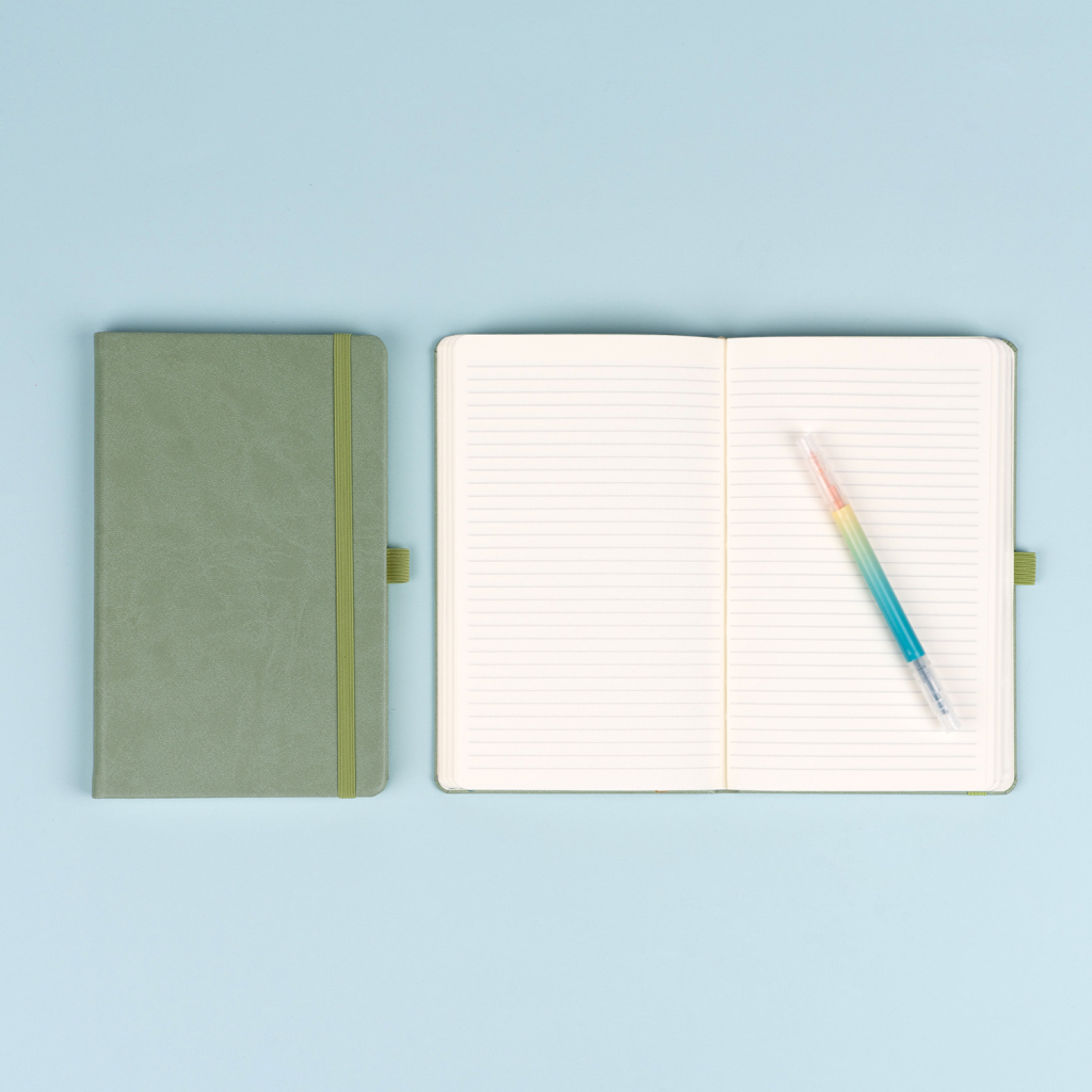 Praktický a lehký linkovaný notes v trendy zelené barvě má povrch s jemnou strukturou, na který si můžete nechat vyrazit logo společnosti. Notes má pevnou knižní vazbu a zakulacené rohy, poutko na tužku, elastickou gumičku a textilní záložku. Linky mají 6 mm a jsou na kvalitním žlutém papíře.