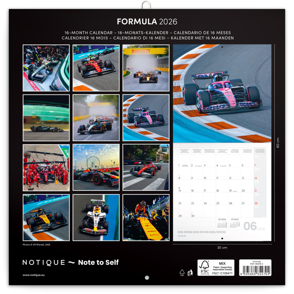 Atraktivní fotografie z prostředí adrenalinového světa Formule 1, zachycené objektivem Jiřího Křenka. V kalendáři kromě fotek najdete přehledné kalendárium od září 2025 do prosince 2026 v šesti jazycích, měsíční fáze, důležité svátky a prostor pro poznámky na každý den.