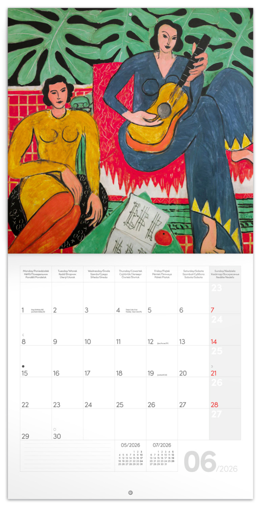 Objevte svět barev a tvarů jednoho z nejvýznamnějších umělců 20. století. Díla Henriho Matisse na stránkách poznámkového kalendáře potěší každého milovníka umění. Obsahuje přehledné kalendárium od září 2025 do prosince 2026 v šesti jazycích, měsíční fáze, důležité svátky a prostor pro poznámky na každý den.