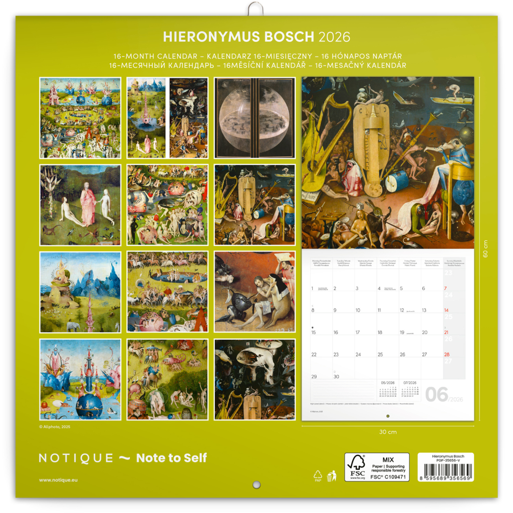 Vydejte se do světa fascinujících a surrealistických obrazů jednoho z nejvýznamnějších malířů pozdní gotiky, Hieronyma Bosche. Jeho neuvěřitelné a detailní kompozice, plné symboliky a fantastických scén, vás zavedou do mystických světů jeho uměleckých vizí. Poznámkový kalendář obsahuje přehledné kalendárium od září 2025 do prosince 2026 v šesti jazycích, měsíční fáze, důležité svátky a prostor pro poznámky na každý den.