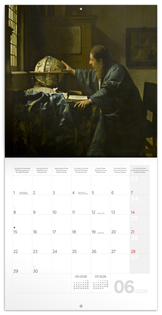 Vstupte do světa mistrovských realistických zobrazení každodenního života malíře Johannese Vermeera. Jeho díla, plná jemné atmosféry a světelných efektů, vás zavedou do zlaté éry holandského baroka. Poznámkový kalendář obsahuje přehledné kalendárium od září 2025 do prosince 2026 v šesti jazycích, měsíční fáze, důležité svátky a prostor pro poznámky na každý den.