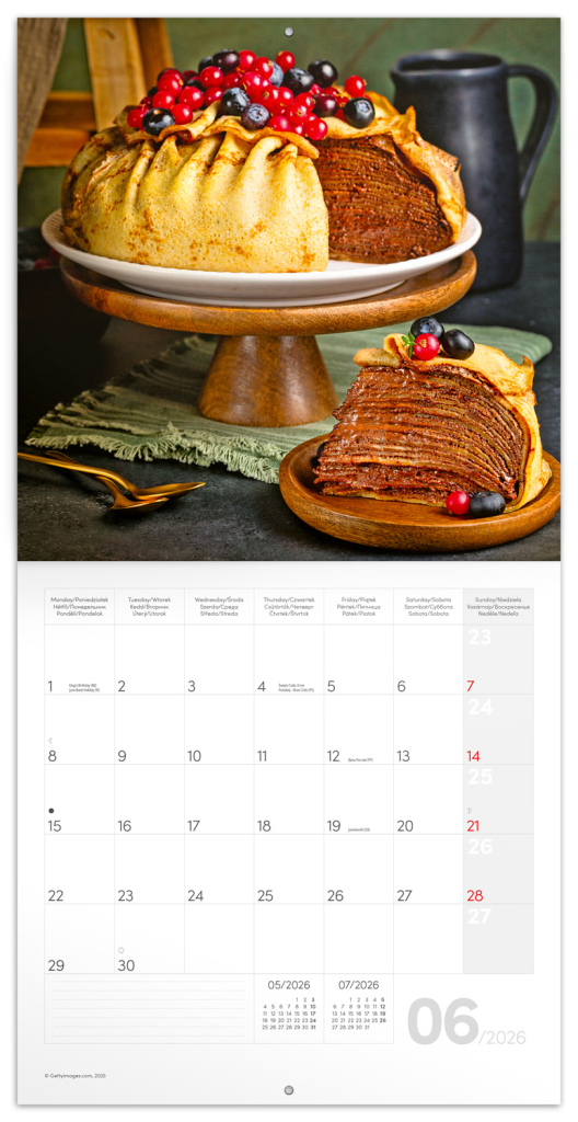 Jedinečný kalendář pro všechny milovníky sladkostí! Ochutnejte různé druhy dortů na stránkách tohoto kalendáře. Uvnitř najdete šestijazyčné kalendárium, měsíční fáze, důležité svátky a prostor pro vaše poznámky a plány.