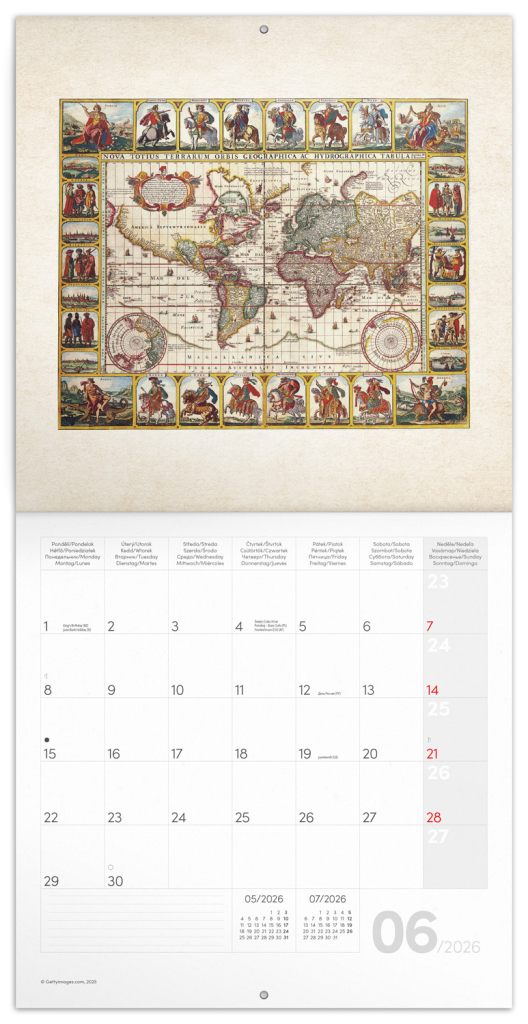 Dvanáct ilustrací starých map v praktickém poznámkovém kalendáři. Kalendář obsahuje přehledné kalendárium od září 2025 do prosince 2026 v osmi jazycích, měsíční fáze, důležité svátky a prostor pro poznámky na každý den. Kalendář je součástí kolekce Plastic Free, je zabalený v obálce z recyklovaného papíru a vytištěný na recyklovaném strukturovaném papíře s vysokou gramáží.