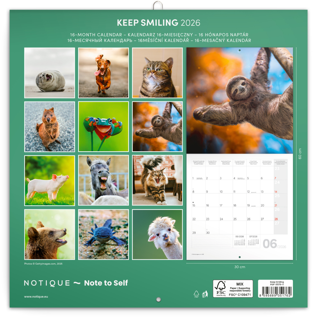Fotografie roztomilých prasátek, opiček nebo lachtanů vám budou dělat radost celý rok. V kalendáři kromě fotek najdete přehledné kalendárium od září 2025 do prosince 2026 v šesti jazycích, měsíční fáze, důležité svátky a prostor pro poznámky na každý den.