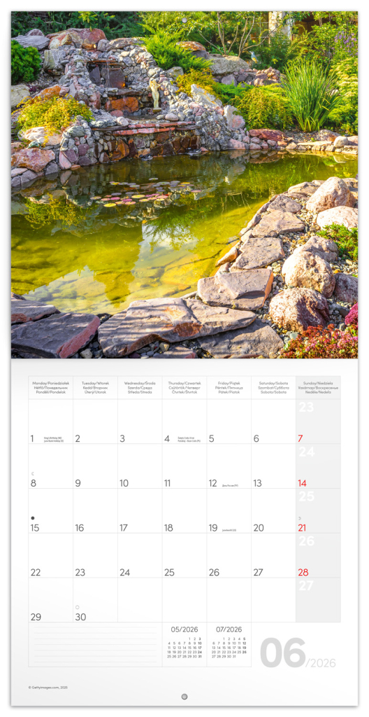 Rozjasněte svůj interiér barevnými fotografiemi šlechtěných zahrad. V kalendáři kromě fotek najdete přehledné kalendárium od září 2025 do prosince 2026 v šesti jazycích, měsíční fáze, důležité svátky a prostor pro poznámky na každý den.