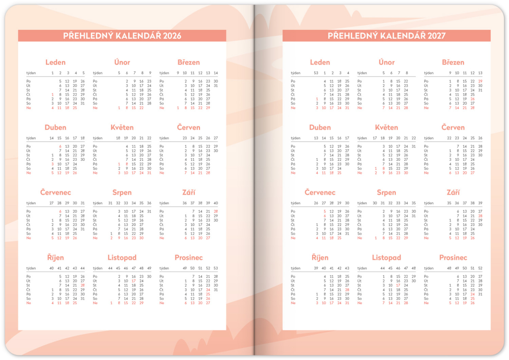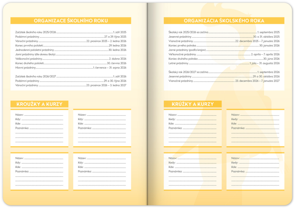 Praktický diář pomůže při plánování aktivit členů rodiny a chodu celé domácnosti. Rozdělen je do týdnů, kde můžete sledovat a do připravených sloupců zapisovat úkoly jednotlivých rodinných příslušníků. Nechybí ani rozvrh hodin pro školáky, nákupní seznamy a prostor pro všechny další důležité poznámky.