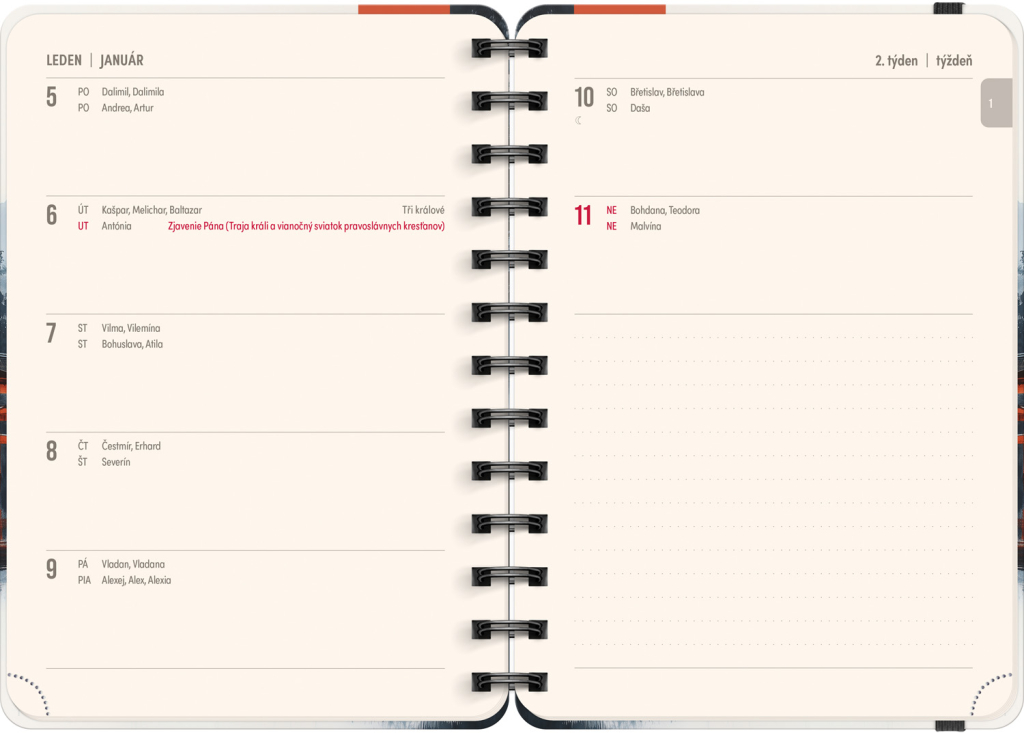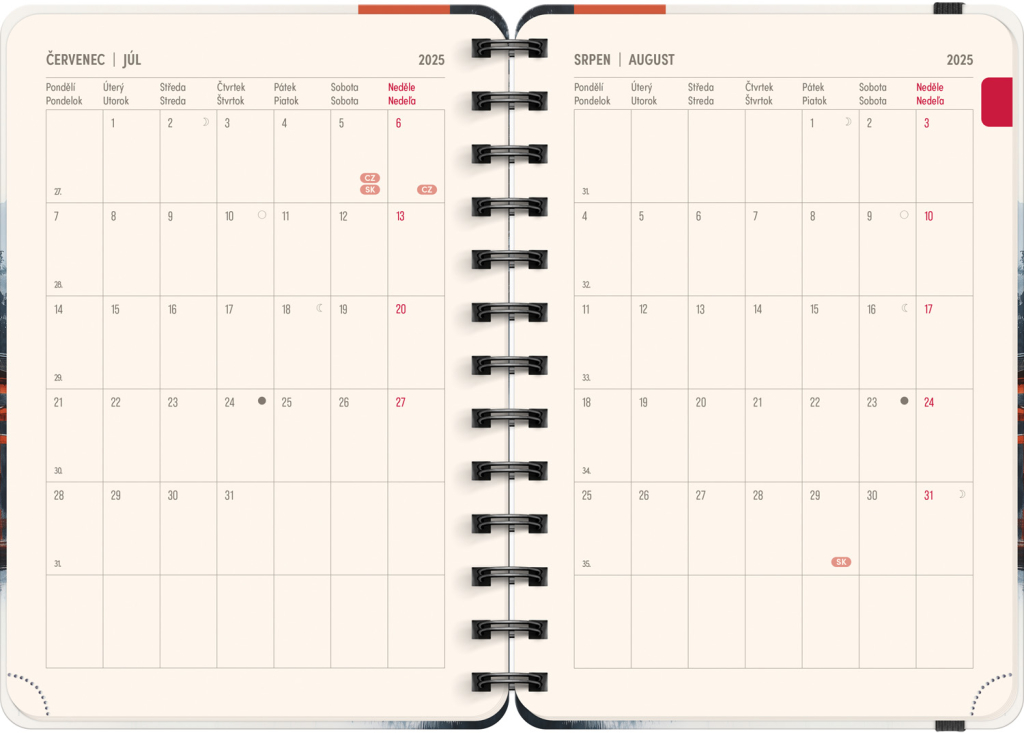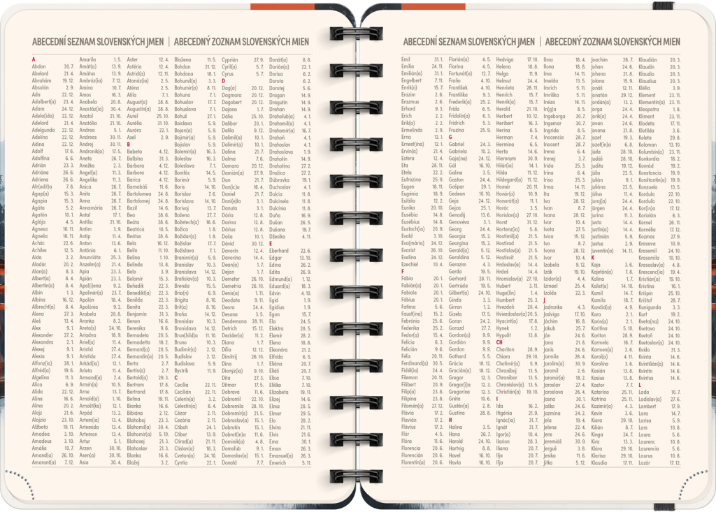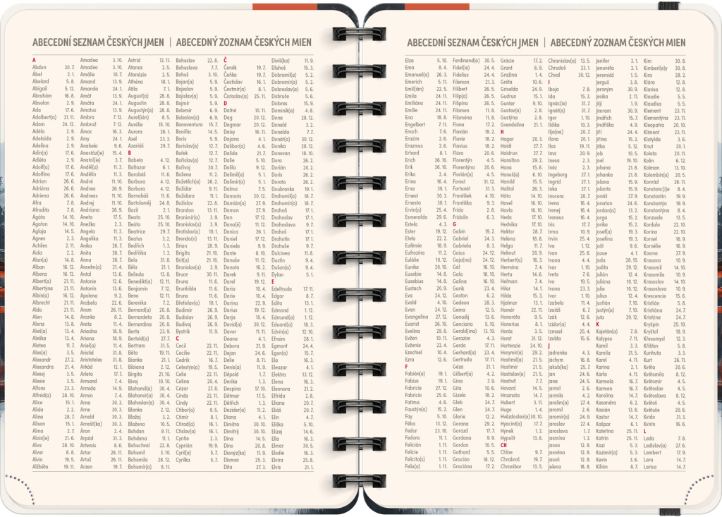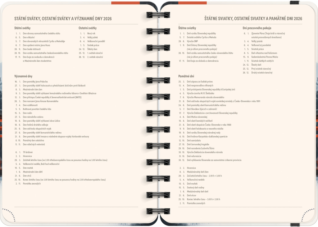Osmnáctiměsíční diář obsahuje přehled na rok 2025 a 2026, seznam českých a slovenských jmen, česko-slovenské týdenní řádkové kalendárium se jmény a svátky a prostor na poznámky. Kalendárium začíná v červenci 2025 a končí v prosinci 2026.