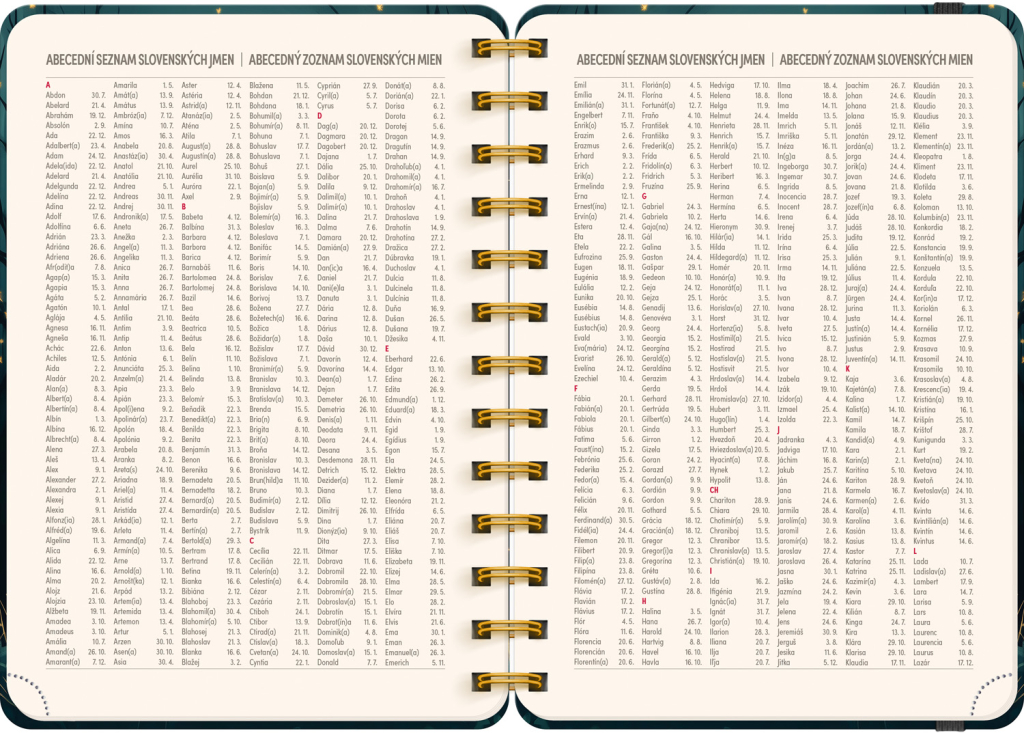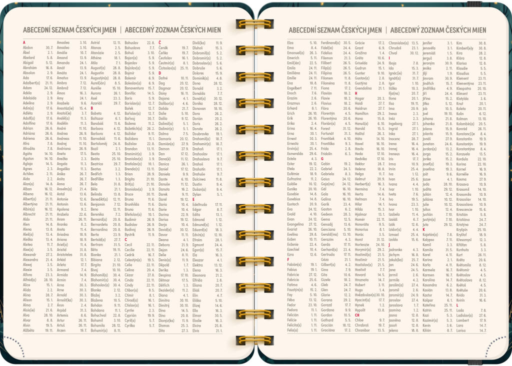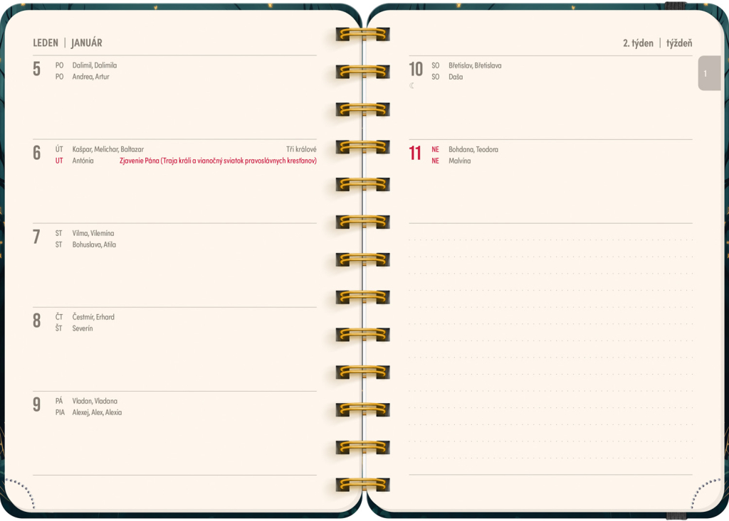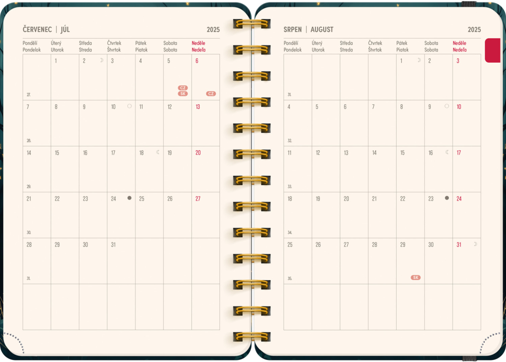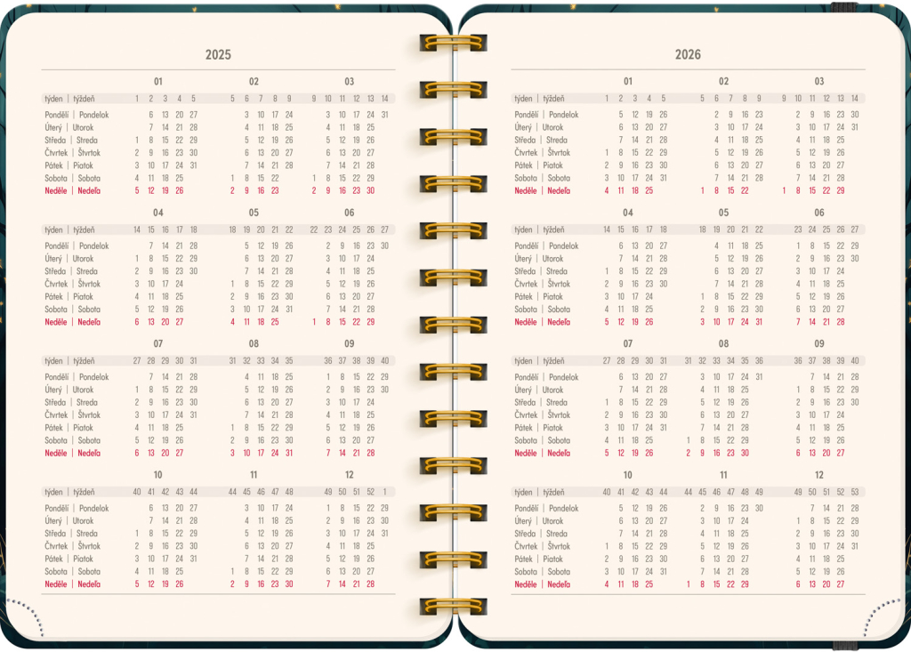 Osmnáctiměsíční diář obsahuje přehled na rok 2025 a 2026, seznam českých a slovenských jmen, česko-slovenské týdenní řádkové kalendárium se jmény a svátky a prostor na poznámky. Kalendárium začíná v červenci 2025 a končí v prosinci 2026.