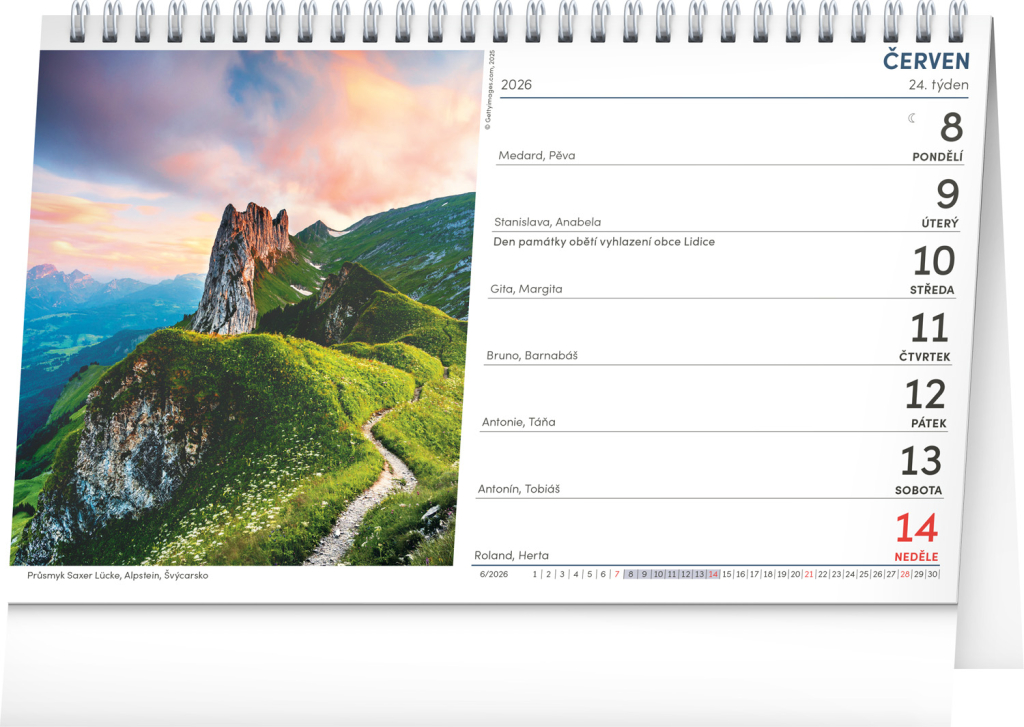 Stolní kalendář s fotografiemi hor a pohoří z celého světa. Prohlédněte si zblízka hory od Washingtonu v USA přes Evropu až po Čínu. Barevné fotografie doplňuje české týdenní kalendárium se jmény, svátky a památnými dny, fázemi měsíce, rozšířený seznam jmen a přehled na rok 2026 a 2027.