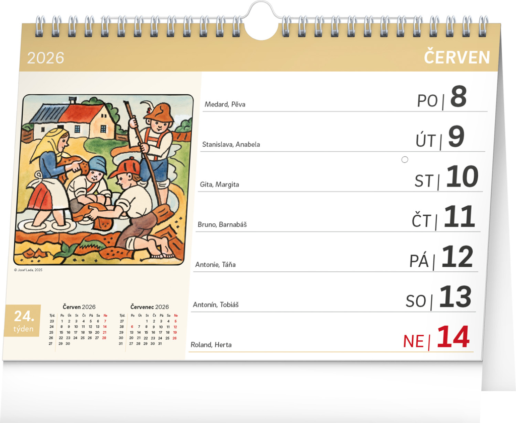 Kromě ilustrací od Josefa Lady se kalendář vyznačuje extra velkým písmem. Díky háčku ho můžete zavěsit na stěnu či ponechat na stole. Obsahuje české kalendárium se jmény, svátky a památnými dny, měsíční přehled a dostatek prostoru na poznámky.