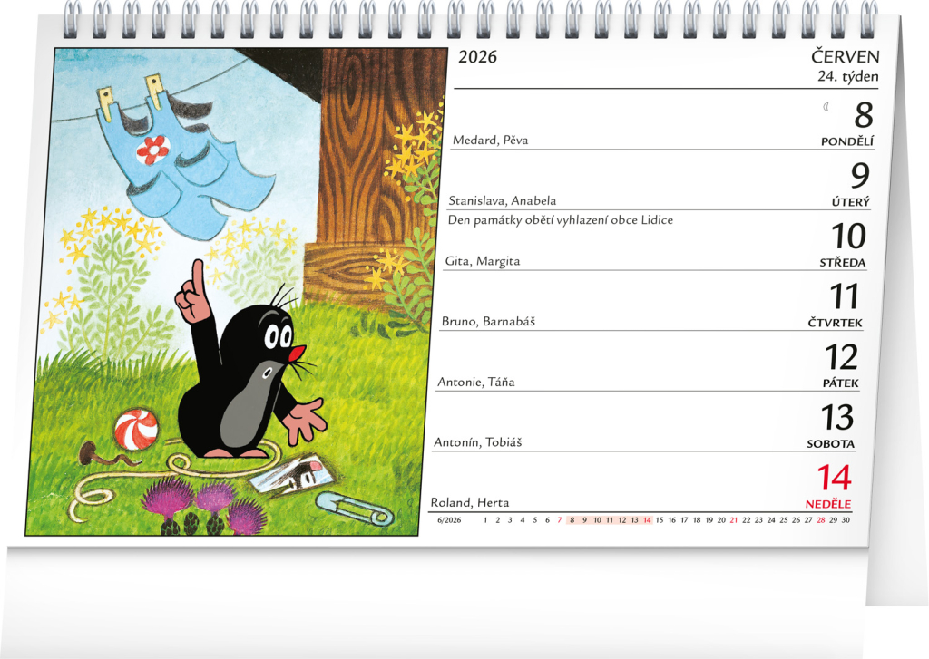 Krtkova dobrodružství si přál v dětství prožívat snad každý z nás. Praktický stolní kalendář s ilustracemi Zdeňka Milera z oblíbených příběhů o Krtečkovi obsahuje jeden obrázek na každý týden, kalendárium s českými jmény, svátky a památnými dny, fázemi měsíce a přehled na rok 2026 a 2027.