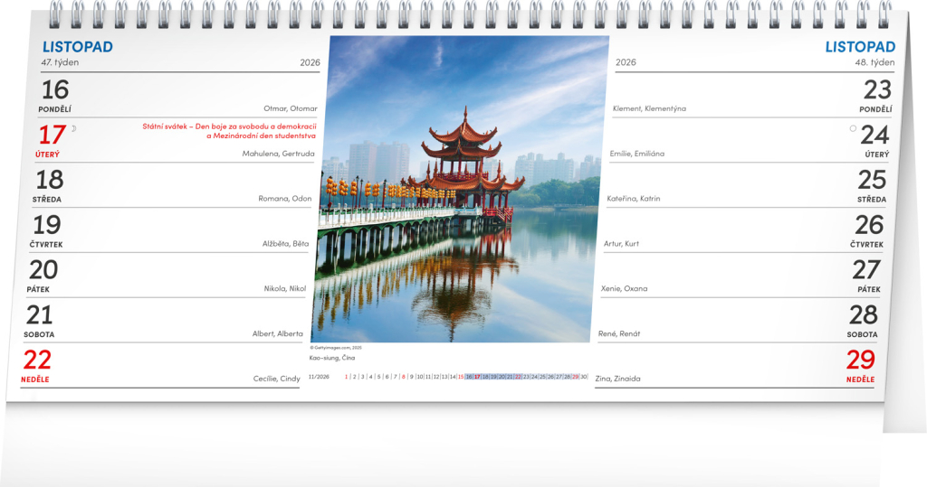 Ve 14-denním stolním kalendáři na vás čekají úchvatné záběry z měst celého světa, dále české kalendárium, svátky a památné dny i měsíční fáze. To vše v přehledném dvoutýdenním rozvržení.