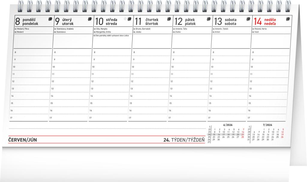Zapište si do stolního kalendáře se sloupcovým kalendáriem své plány, schůzky a důležitá data. Dostatek místa na poznámky v jednotlivých dnech a přehlednost struktury kalendária doplňují česká a slovenská jména, svátky a památné dny.