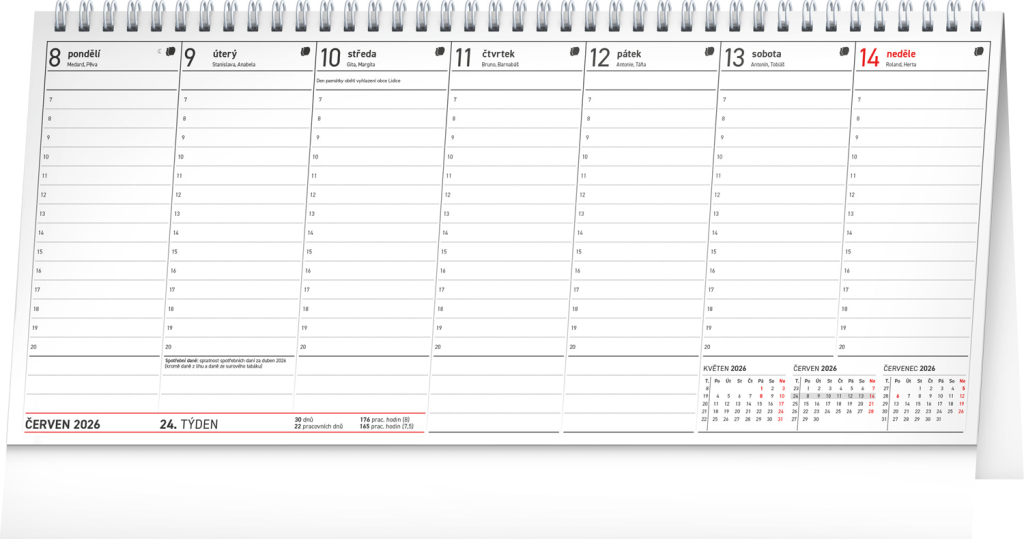 Stolní kalendář se sloupcovým kalendáriem obsahuje všechny termíny daňových povinností, česká jména, svátky a památné dny a tříměsíční přehled u každého týdne. Přehledně si naplánujete svůj čas, u každého dne je dostatek prostru na poznámky.