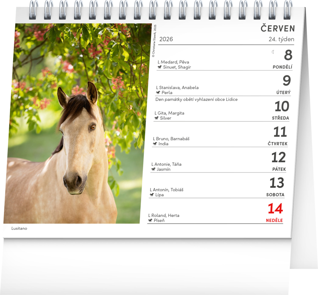 Oslavte svátek spolu se svým koňským parťákem – v tomto praktickém stolním kalendáři najdete jména koní na každý den. Kalendář zdobí hezké fotografie od Christiane Slawik a nechybí ani prostor na poznámky.