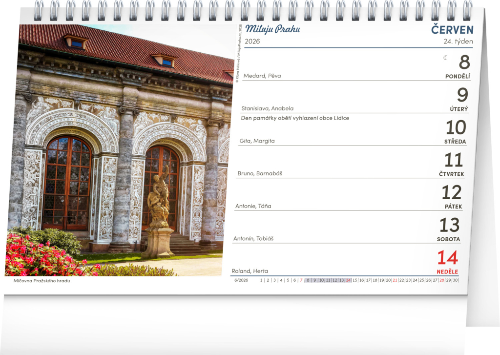 Praha a její zákoutí na fotografiích stolního kalendáře připraveného ve spolupráci se značkou Miluju Prahu. Pro rok 2026 byly použity fotografie od Kláry Hášové. Kalendář doplňuje české týdenní kalendárium se jmény, svátky a památnými dny, fázemi měsíce a rozšířený seznam jmen.
