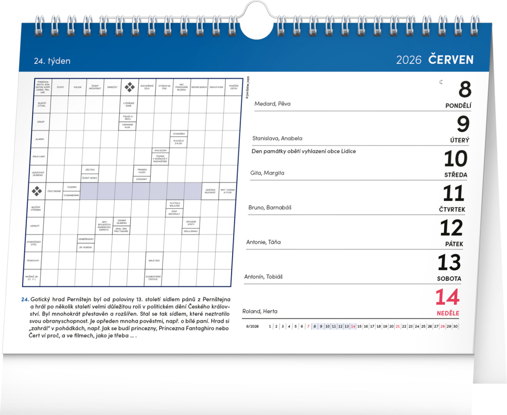 Stolní kalendář s křížovkami na každý týden. Díky háčku ho můžete zavěsit na stěnu či ponechat na stole. Obsahuje české kalendárium se jmény, svátky a památnými dny, měsíční přehled a dostatek prostoru na poznámky.
