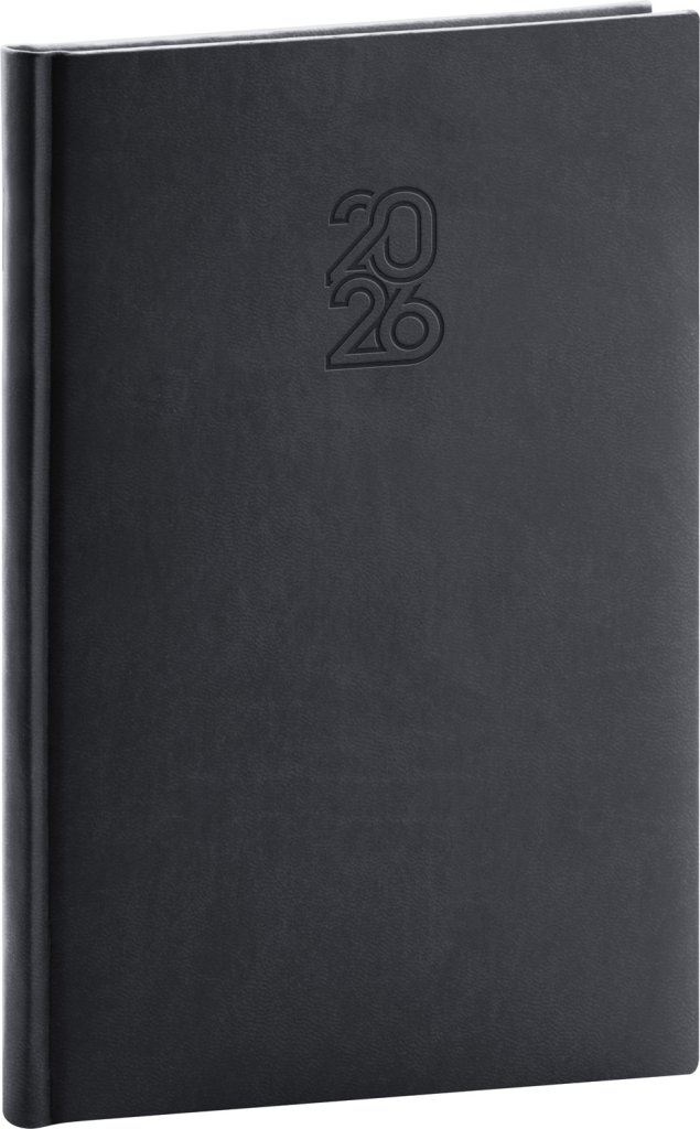 Týdenní diář Aprint 2026 v černé barvě. Kolekce vsadila na osvědčené barvy, které doplňuje nová ražba letopočtu. Týdenní rozvrh s česko-slovenským kalendáriem a doplňkovou angličtinou, němčinou, maďarštinou a ruštinou.