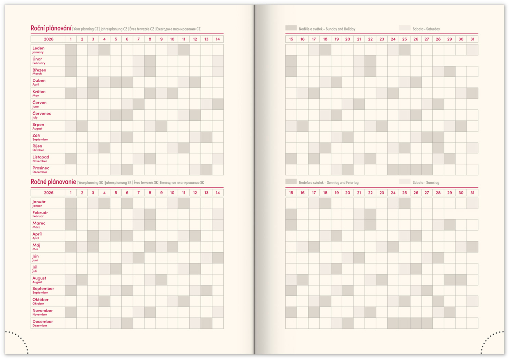 Nová řada diářů s výrazným letopočtem. Povrch má jemnou strukturu a je vhodný pro všechny typy ražeb. Týdenní rozložení s česko-slovenským kalendáriem a doplňkovou angličtinou, němčinou, maďarštinou a ruštinou.