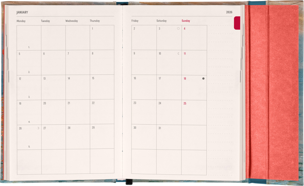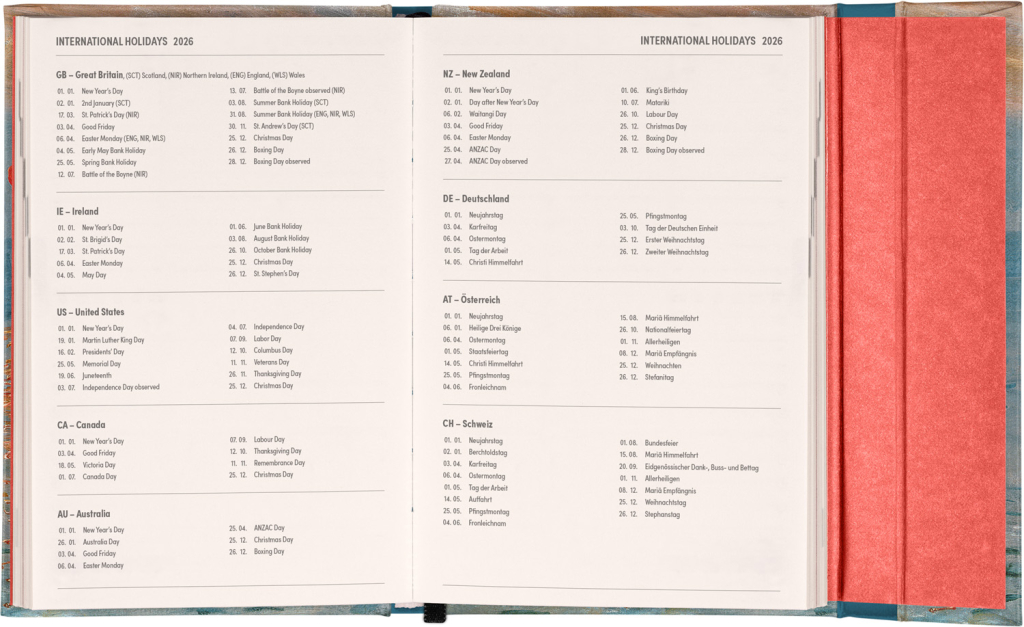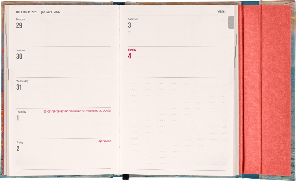 Týdenní diář v anglickém jazyce s mezinárodními svátky a praktickým magnetickým uzavíráním je ideální volbou pro ty, kteří chtějí mít své plány přehledně pod kontrolou. Nabízí horizontální rozložení ve verzi týden na dvou stranách s prostorem pro poznámky. Součástí jsou praktické měsíční přehledy, ideální pro plánování dovolených či prázdnin.
