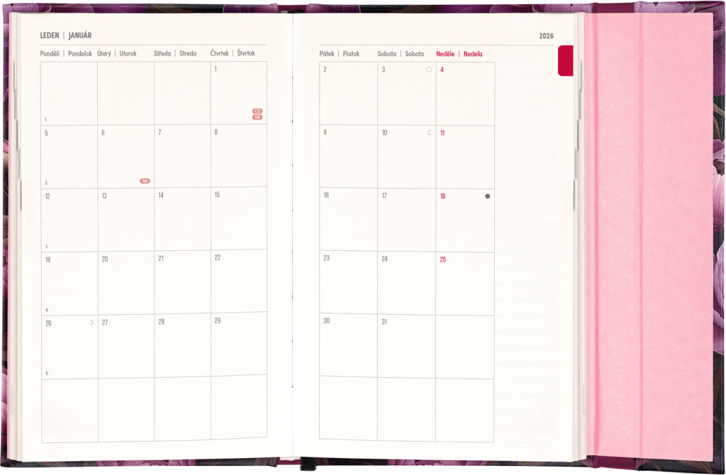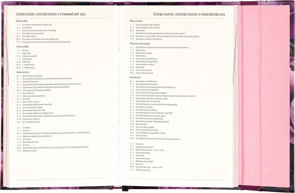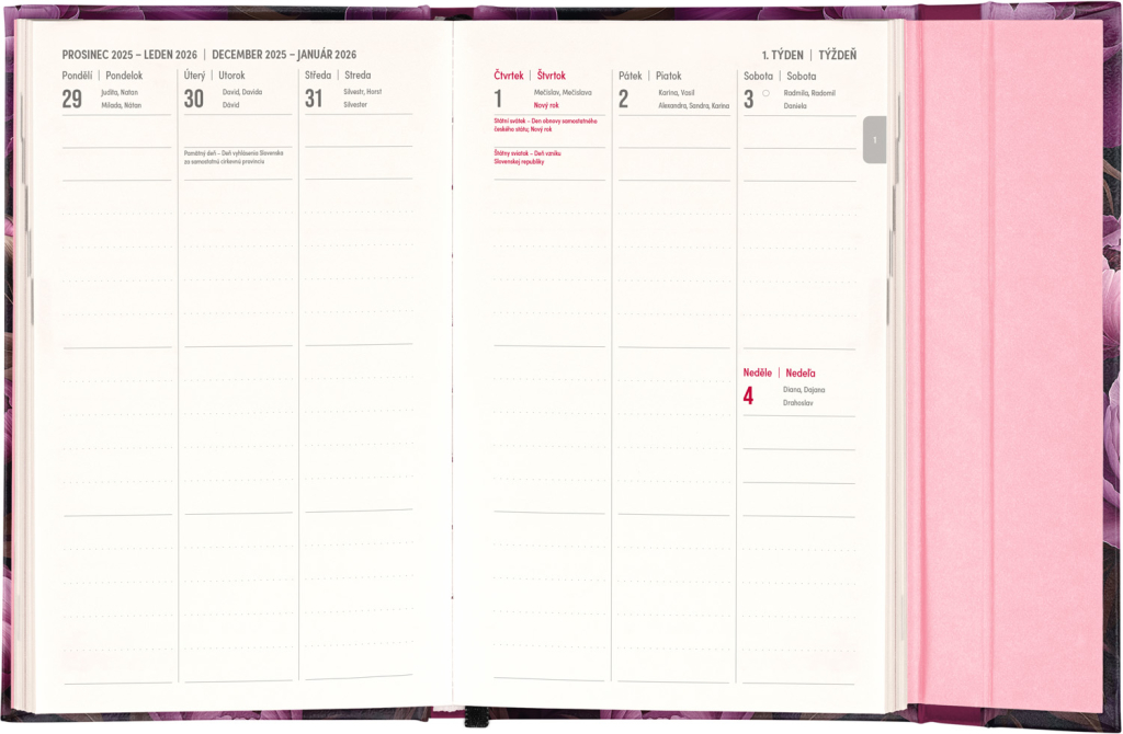 Týdenní diář s praktickým magnetickým uzavíráním je ideální volbou pro ty, kteří chtějí mít své plány přehledně pod kontrolou. Nabízí sloupcové rozvržení jednotlivých týdnů s dostatkem prostoru pro každodenní poznámky. Součástí jsou praktické měsíční přehledy, ideální pro plánování dovolených či prázdnin, a také seznam českých a slovenských svátků a jmenin.