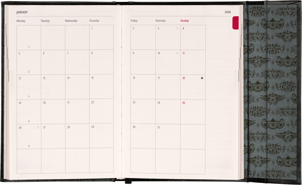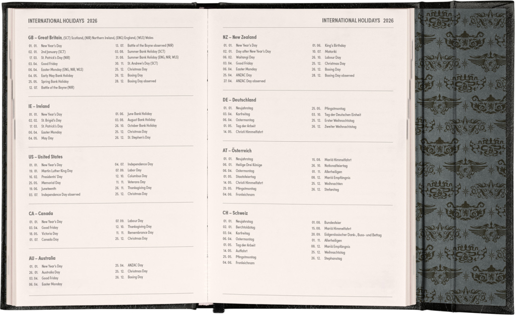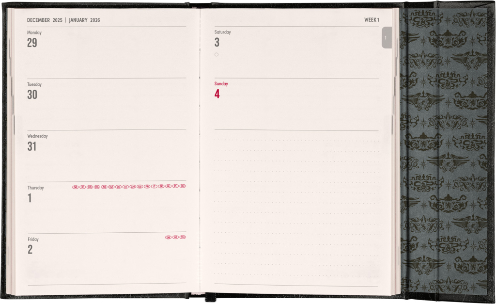 Týdenní diář v anglickém jazyce s mezinárodními svátky a praktickým magnetickým uzavíráním je ideální volbou pro ty, kteří chtějí mít své plány přehledně pod kontrolou. Nabízí horizontální rozložení ve verzi týden na dvou stranách s prostorem pro poznámky. Součástí jsou praktické měsíční přehledy, ideální pro plánování dovolených či prázdnin.
