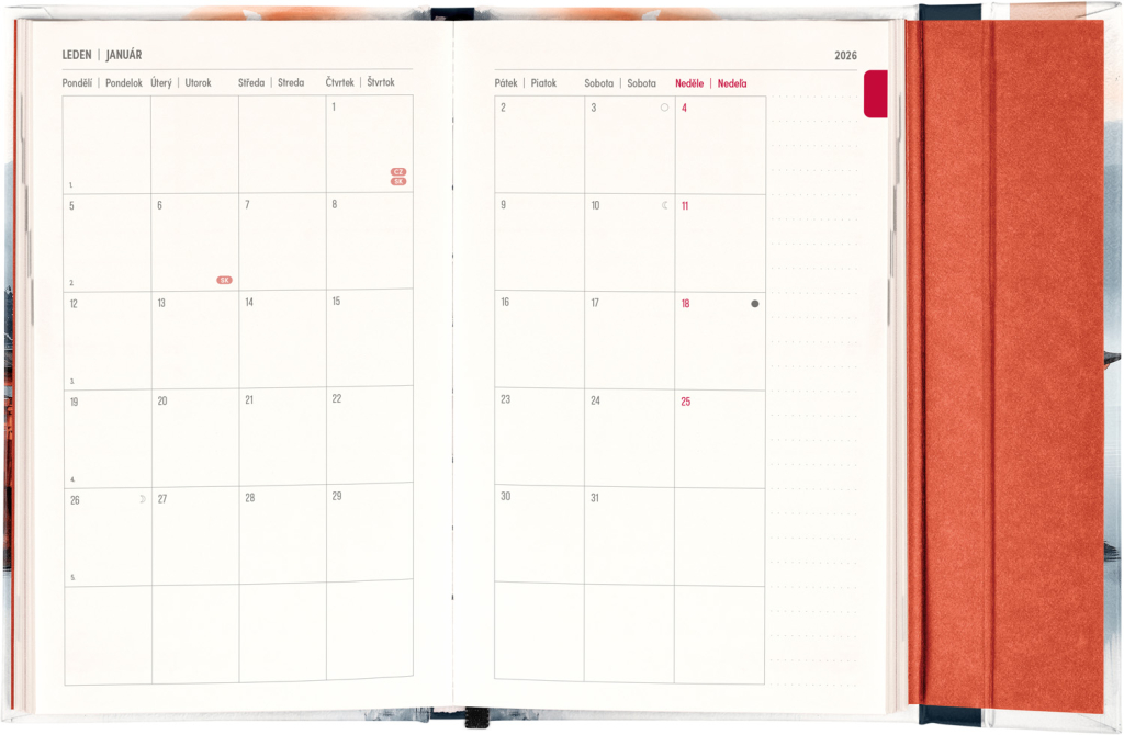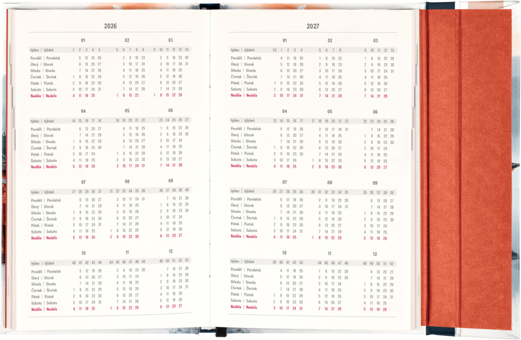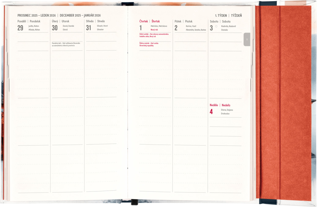 Týdenní diář s praktickým magnetickým uzavíráním je ideální volbou pro ty, kteří chtějí mít své plány přehledně pod kontrolou. Nabízí sloupcové rozvržení jednotlivých týdnů s dostatkem prostoru pro každodenní poznámky. Součástí jsou praktické měsíční přehledy, ideální pro plánování dovolených či prázdnin, a také seznam českých a slovenských svátků a jmenin.