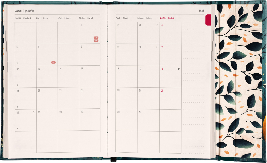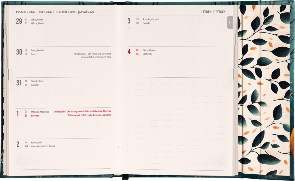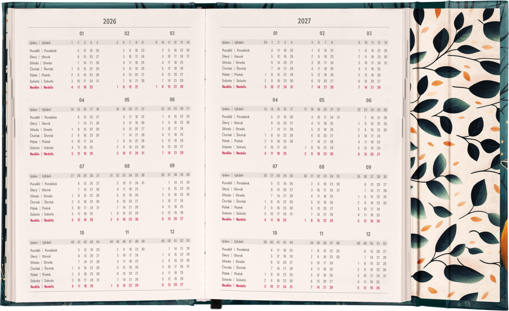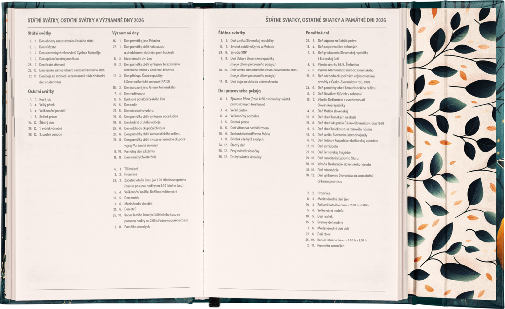 Týdenní diář s praktickým magnetickým uzavíráním je ideální volbou pro ty, kteří chtějí mít své plány přehledně pod kontrolou. Horizontální rozložení s českým a slovenským kalendáriem ve verzi týden na dvou stranách s prostorem pro poznámky. Součástí jsou praktické měsíční přehledy, ideální pro plánování dovolených či prázdnin, a také seznam českých a slovenských svátků a jmenin.