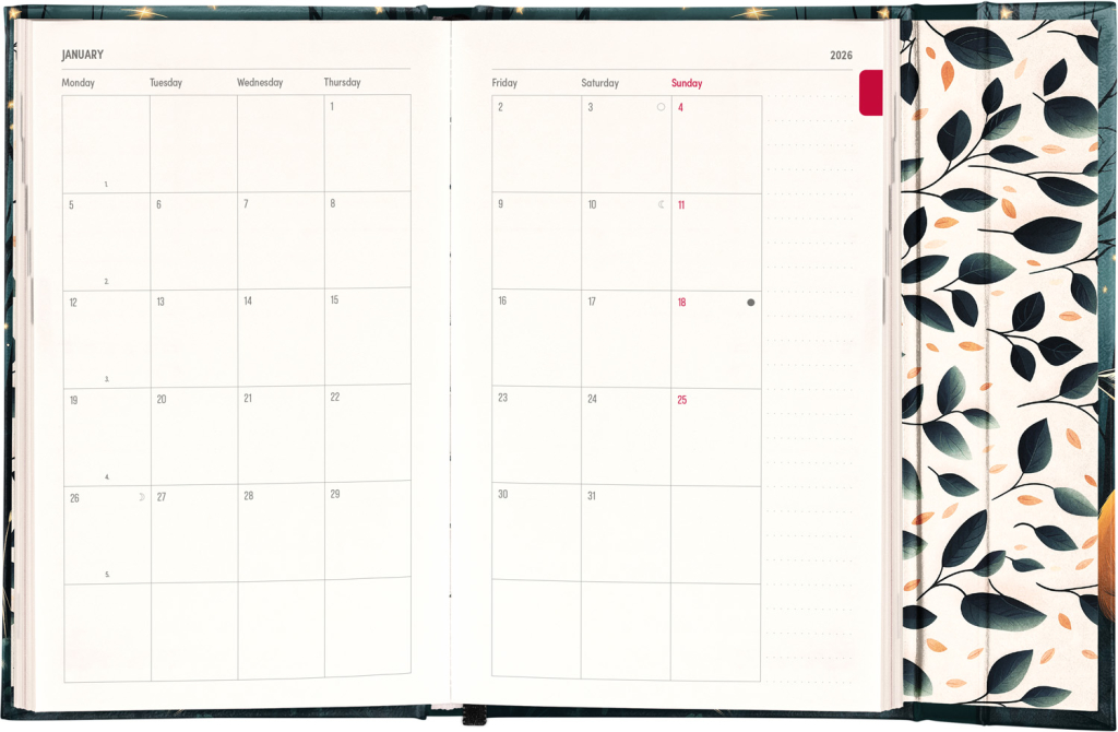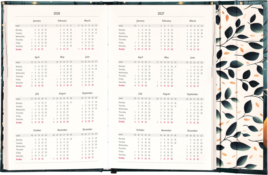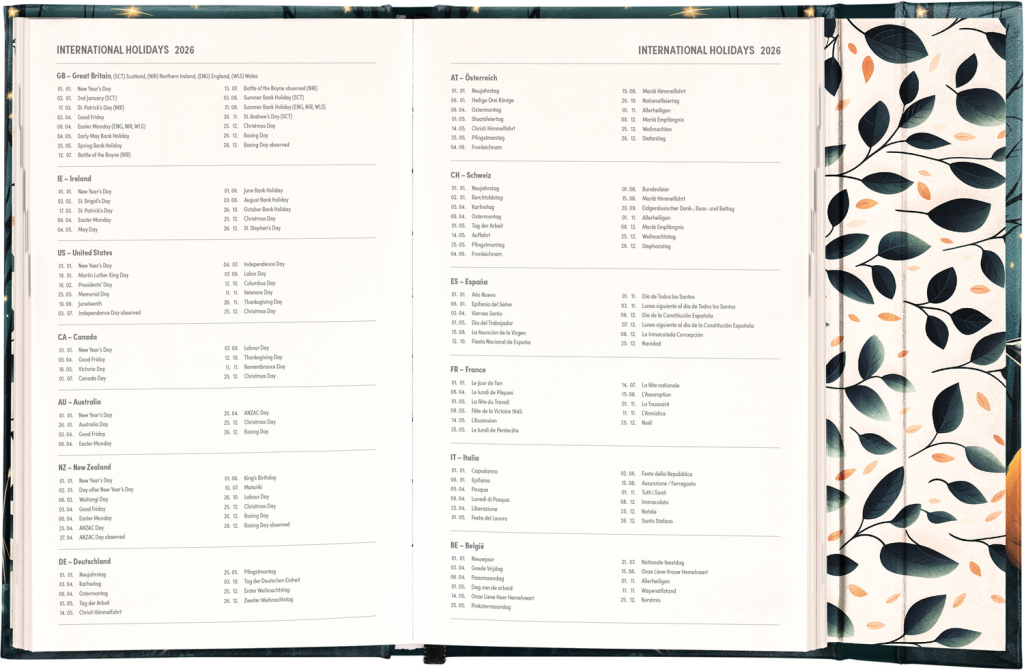 Týdenní diář v anglickém jazyce s mezinárodními svátky a praktickým magnetickým uzavíráním je ideální volbou pro ty, kteří chtějí mít své plány přehledně pod kontrolou. Nabízí sloupcové rozvržení jednotlivých týdnů s dostatkem prostoru pro každodenní poznámky. Součástí jsou praktické měsíční přehledy, ideální pro plánování dovolených či prázdnin.