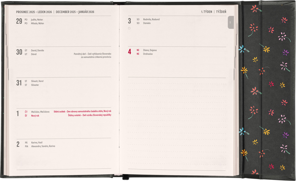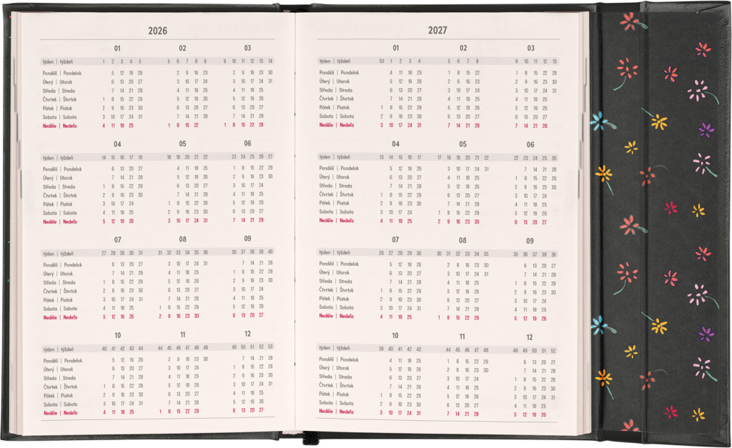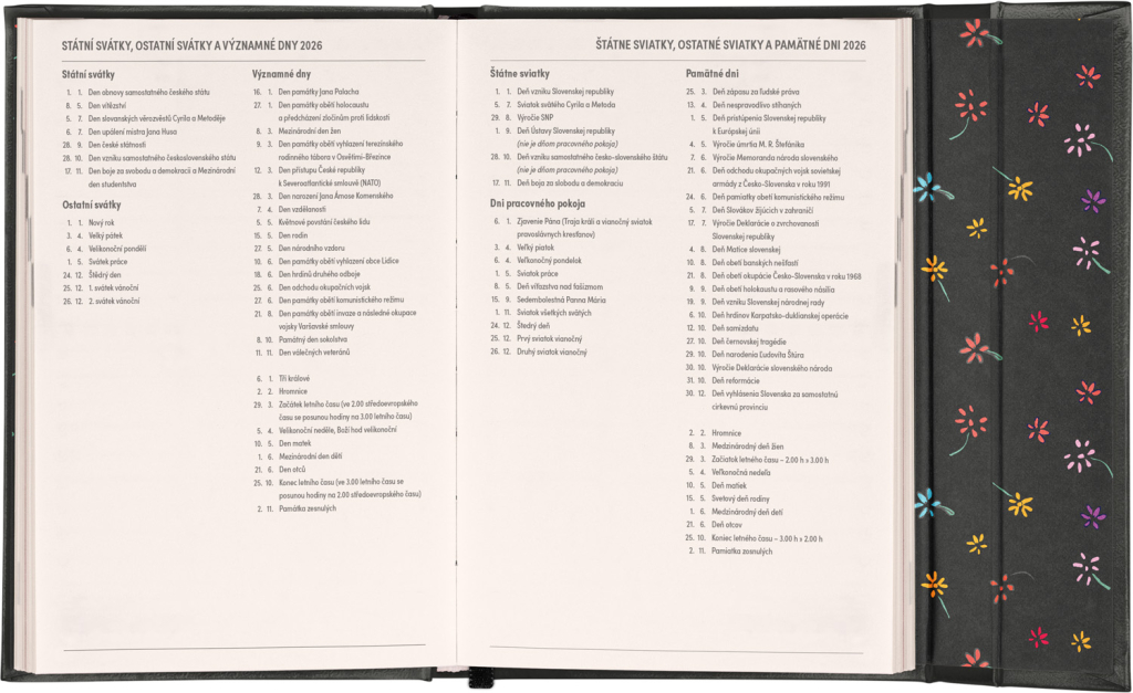 Týdenní diář s praktickým magnetickým uzavíráním je ideální volbou pro ty, kteří chtějí mít své plány přehledně pod kontrolou. Horizontální rozložení s českým a slovenským kalendáriem ve verzi týden na dvou stranách s prostorem pro poznámky. Součástí jsou praktické měsíční přehledy, ideální pro plánování dovolených či prázdnin, a také seznam českých a slovenských svátků a jmenin.