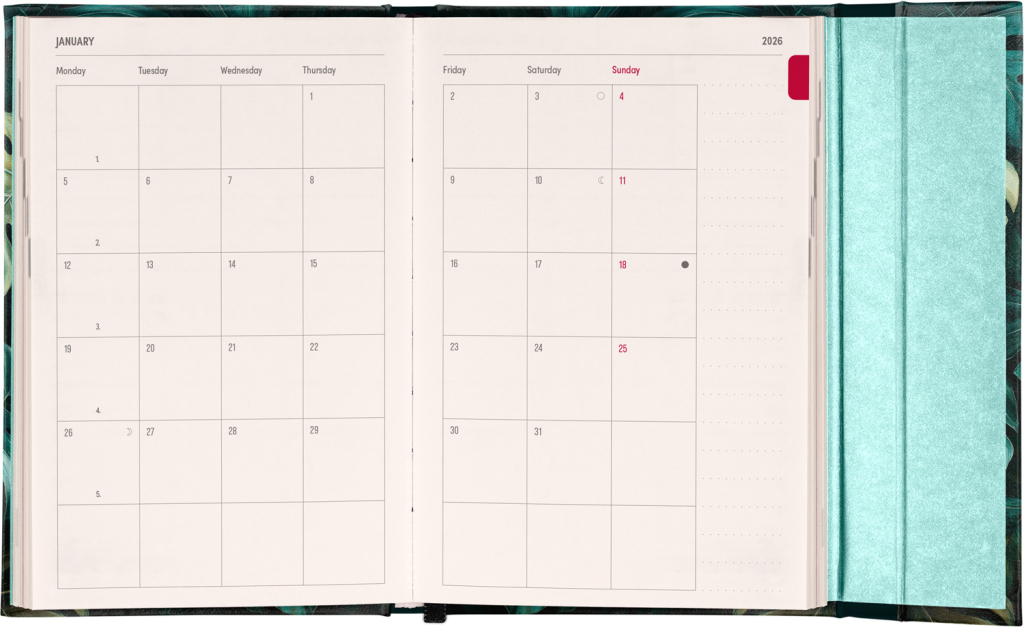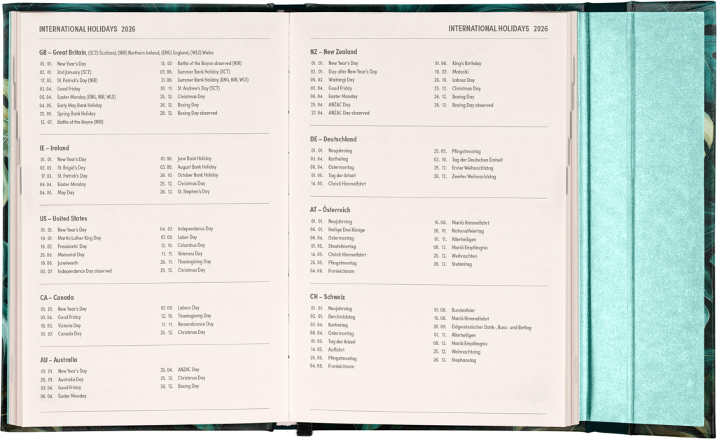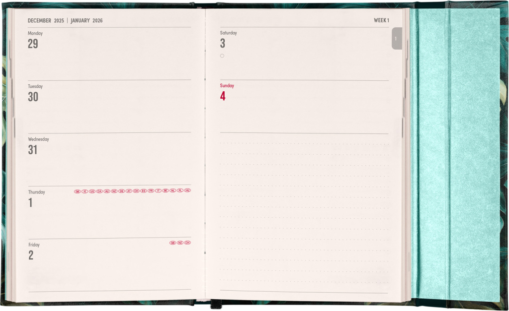 Týdenní diář v anglickém jazyce s mezinárodními svátky a praktickým magnetickým uzavíráním je ideální volbou pro ty, kteří chtějí mít své plány přehledně pod kontrolou. Nabízí horizontální rozložení ve verzi týden na dvou stranách s prostorem pro poznámky. Součástí jsou praktické měsíční přehledy, ideální pro plánování dovolených či prázdnin.