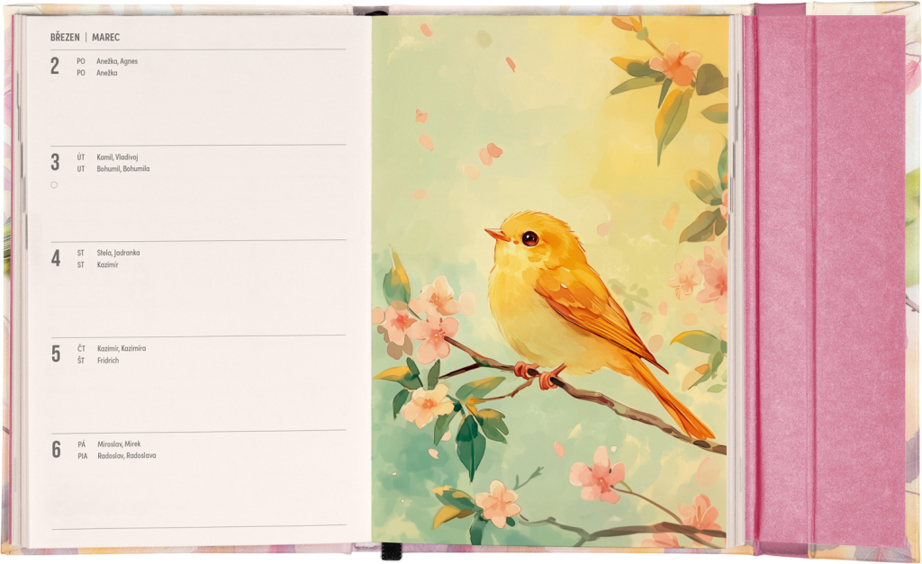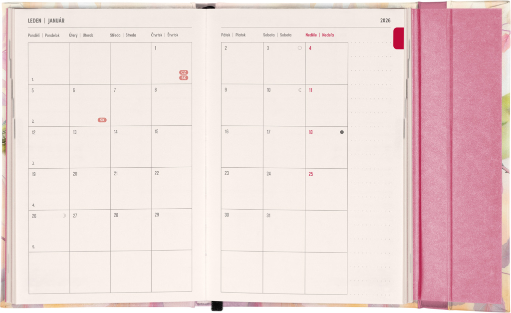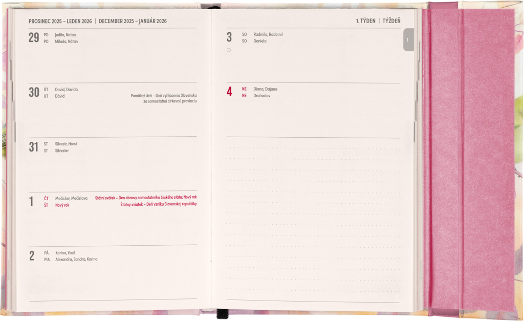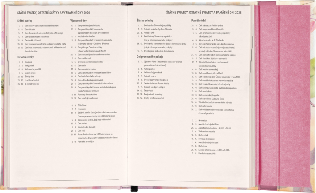 Týdenní diář s praktickým magnetickým uzavíráním je ideální volbou pro ty, kteří chtějí mít své plány přehledně pod kontrolou. Horizontální rozložení s českým a slovenským kalendáriem ve verzi týden na dvou stranách s prostorem pro poznámky. Součástí jsou praktické měsíční přehledy, ideální pro plánování dovolených či prázdnin, a také seznam českých a slovenských svátků a jmenin.