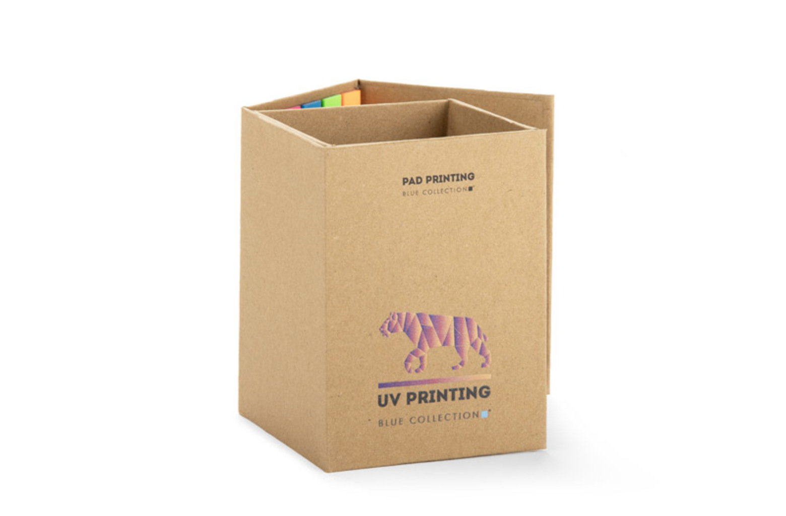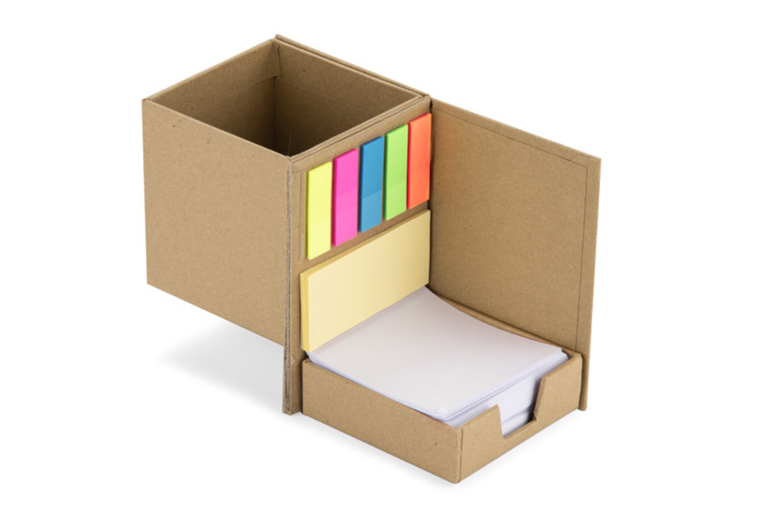 Stolní držák KOS je funkční reklamní pomůcka z kraftového papíru. Ve složeném stavu slouží jako elegantní stojan na kancelářské potřeby a udržuje pořádek na pracovním stole. Po rozložení odhalí sadu samolepicích papírků, včetně pěti fóliových fixů v různých barvách (po 25 kusech), středně velkých žlutých samolepicích papírků (25 kusů) a přibližně 200 volných listů o rozměrech 72x72 mm, umístěných ve vyhrazeném prostoru. Box na nářadí KOS je vybaven také prostorem pro poznámky se stíratelným fixem, což zvyšuje jeho funkčnost. Díky možnosti brandování na něj můžete umístit své logo nebo jiný propagační text, což z něj činí dokonalý nástroj pro budování značky.