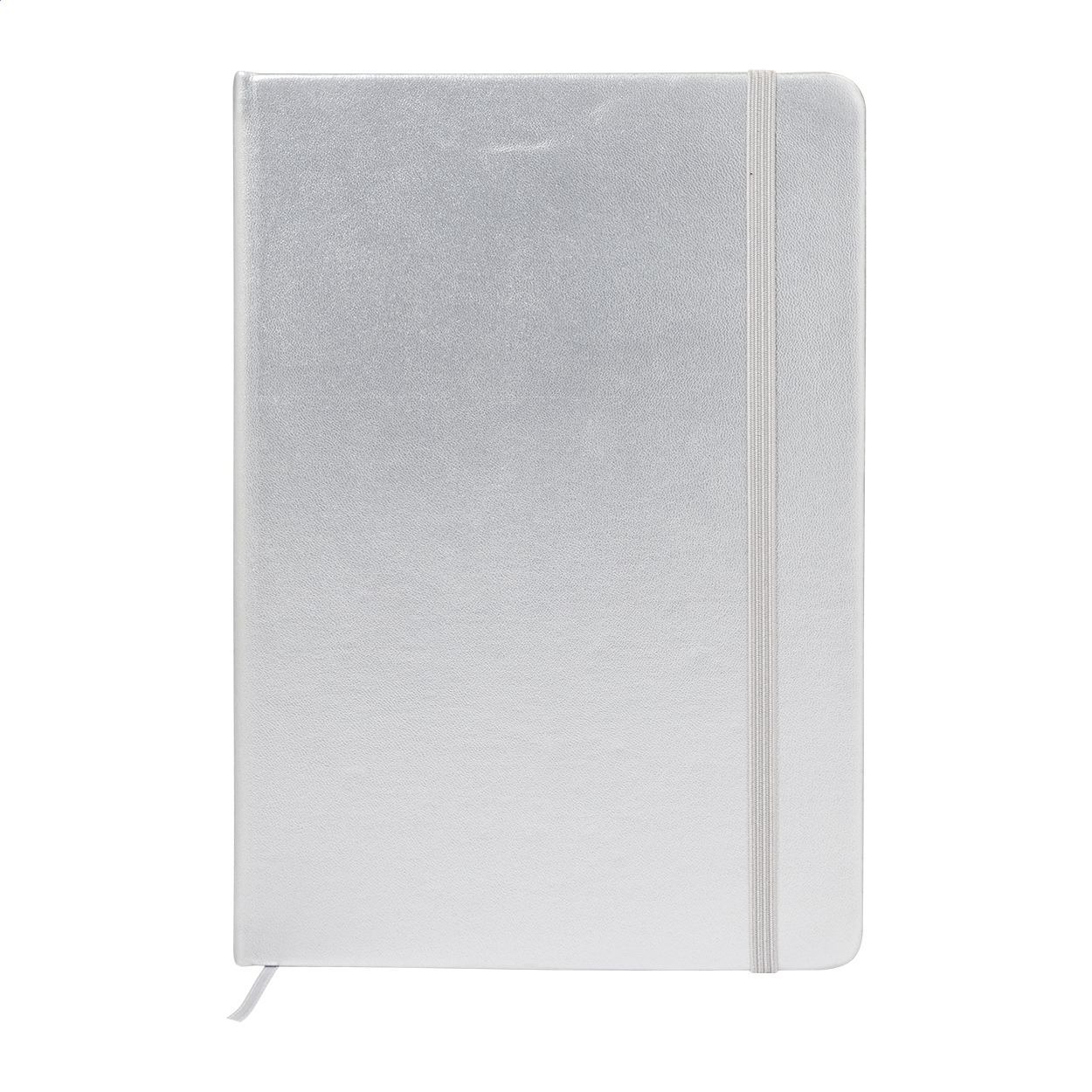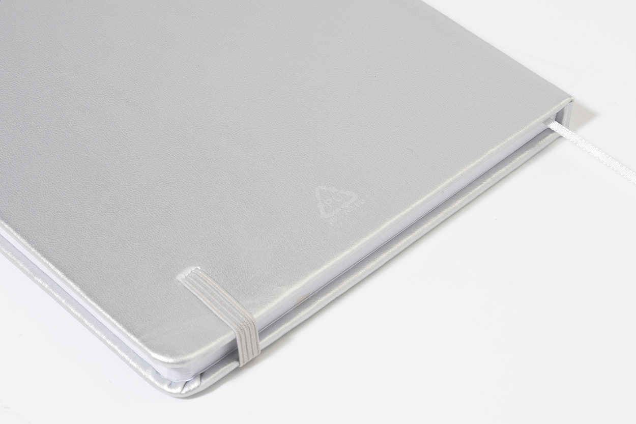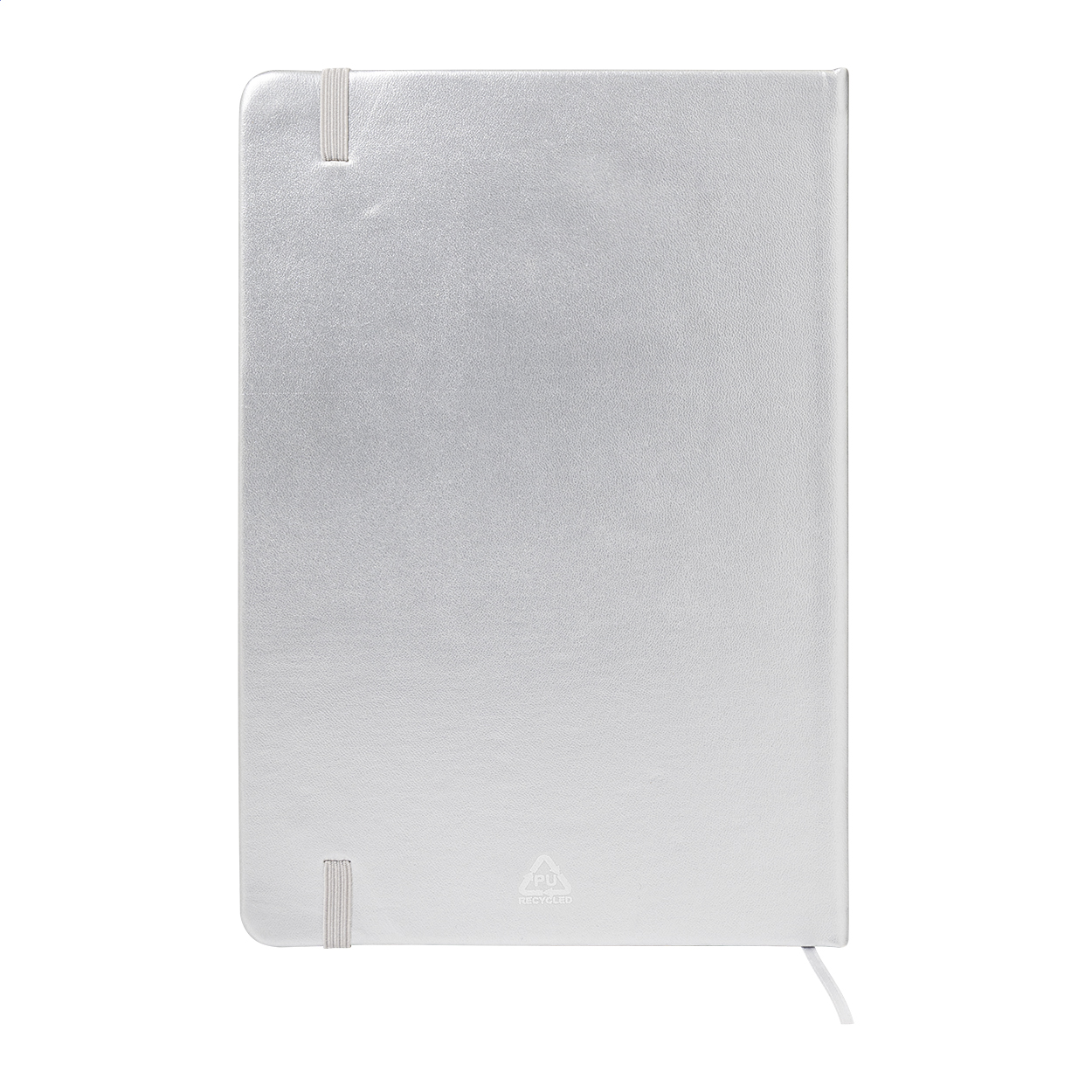 Blok A5 s potahem z recyklované PU kůže s metalickou úpravou se 100 linkovanými listy z recyklovaného papíru. S barevnou záložkou a gumičkou.