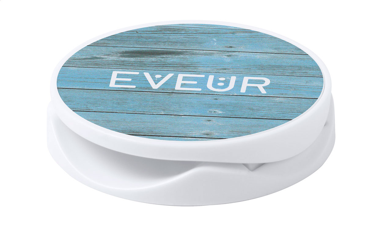 Kulatý, plastový stojánek na mobil s kroužkem na prst se samolepící stranou.