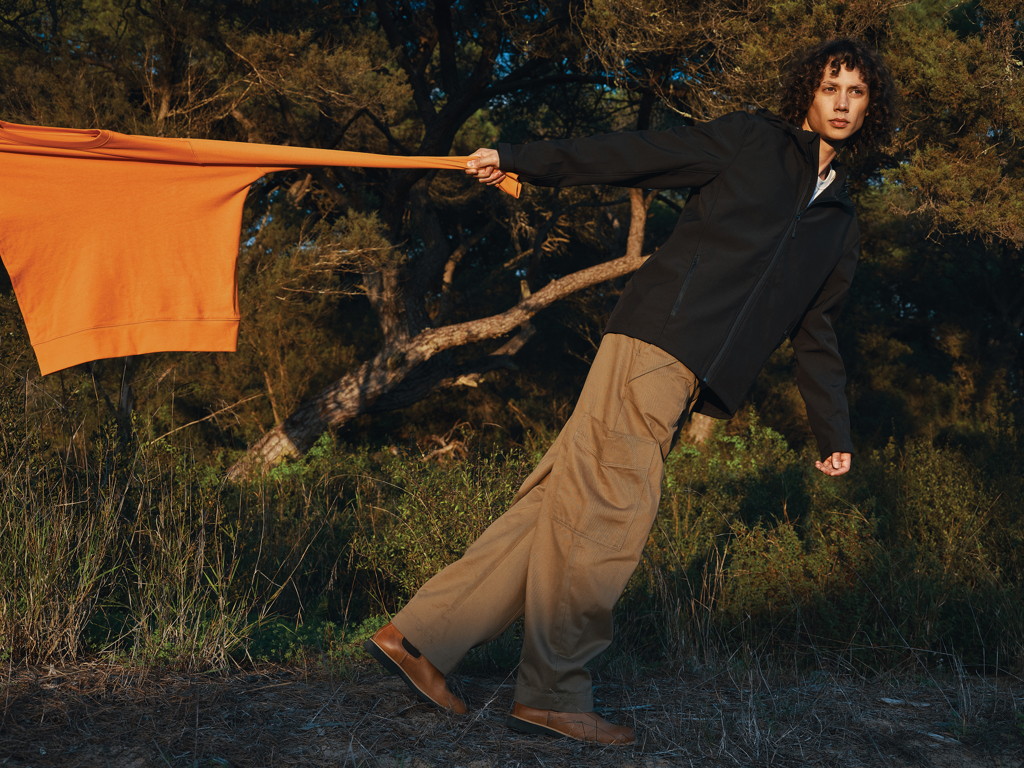 khaki, 91 % recyklovaný polyester a 7 % recyklovaný TPU a 2 % elastan