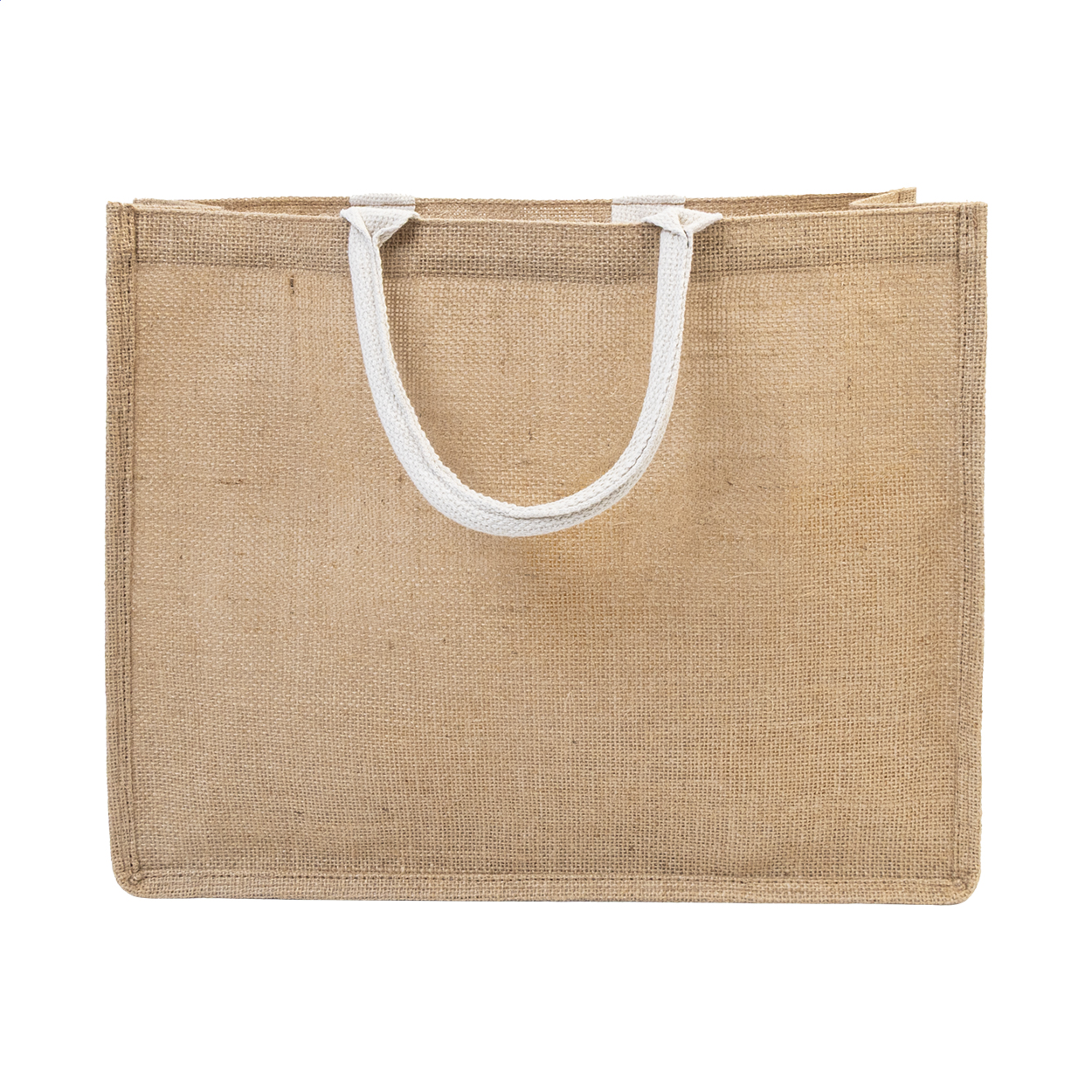 Plážová taška z laminované juty s bavlněnými uchy a přední kapsou.