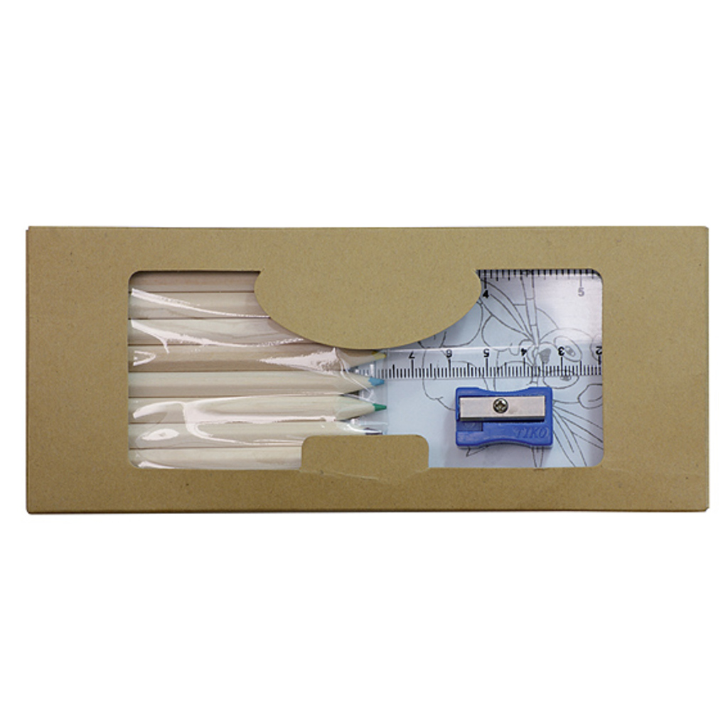 Komplet mladého umělce obsahující barevnou knihu, 10 dřevěných barevných tužek, pravítko a ořezávátko. Logo by mohlo být vytištěno na kartonu.