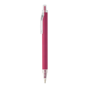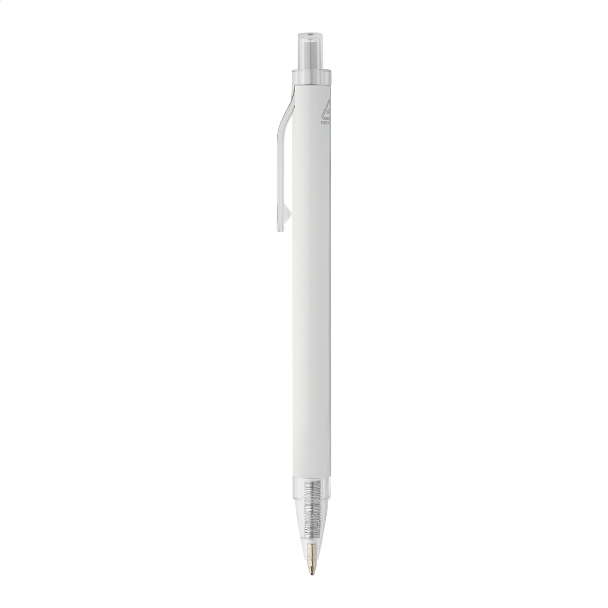 Kuličkové pero z recyklovaného hliníku s matným tělem a průhlednými RPET částmi. S modrou náplní.