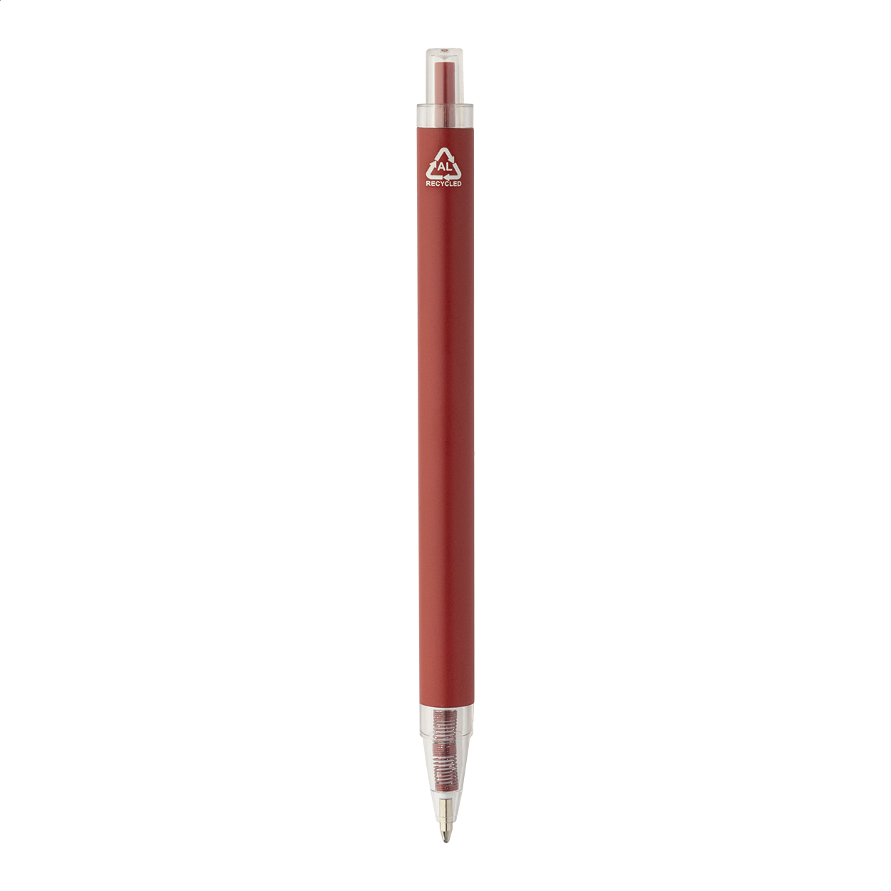 Kuličkové pero z recyklovaného hliníku s matným tělem a průhlednými RPET částmi. S modrou náplní.