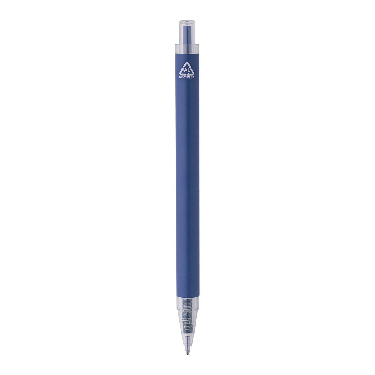 Kuličkové pero z recyklovaného hliníku s matným tělem a průhlednými RPET částmi. S modrou náplní.