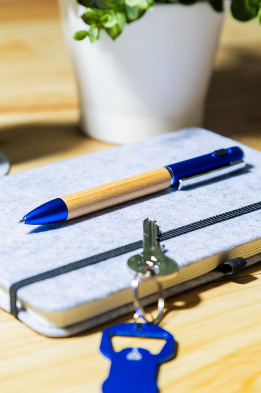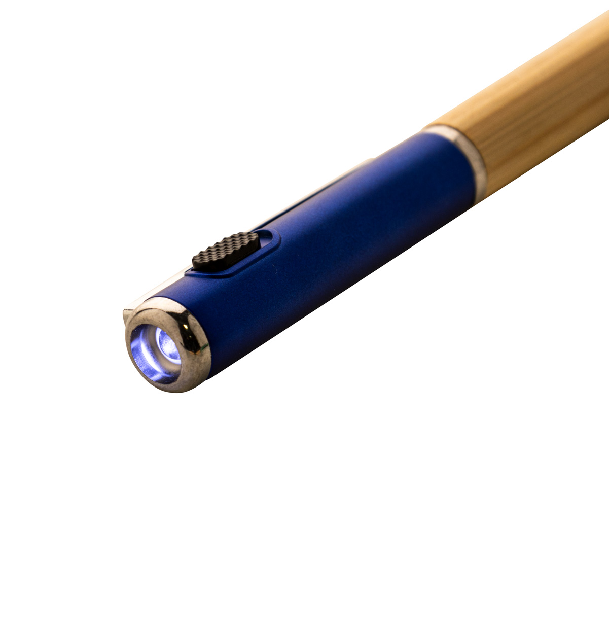 Kuličkové pero z bambusu a recyklovaného ABS plastu s 1 LED svítilnou. S modrou náplní a knoflíkovou baterií.