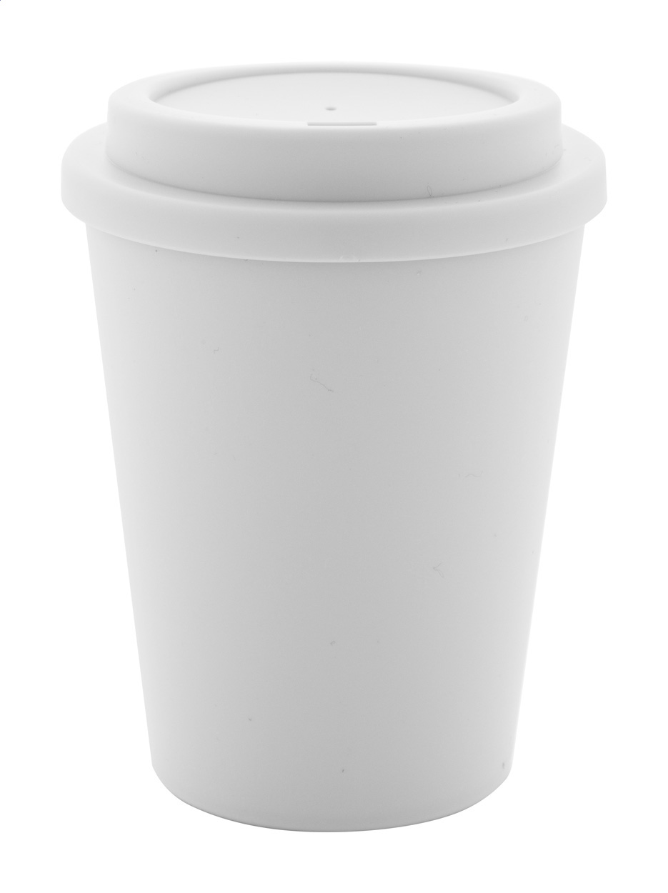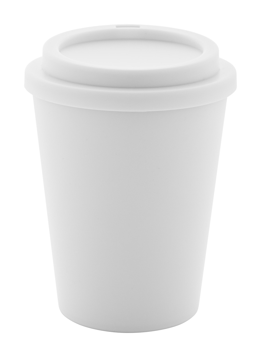 Dvoustěnný termo hrnek izolovaný PP plastem s víčkem na pití. 300 ml.
