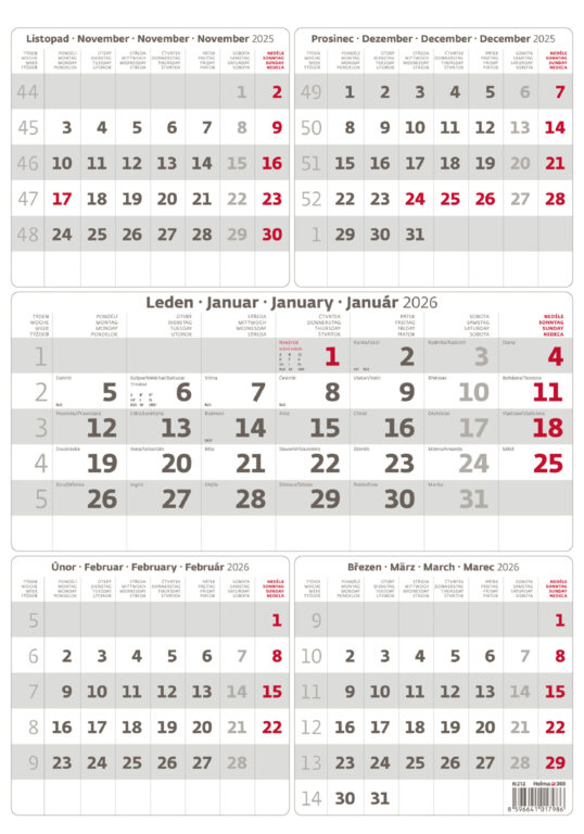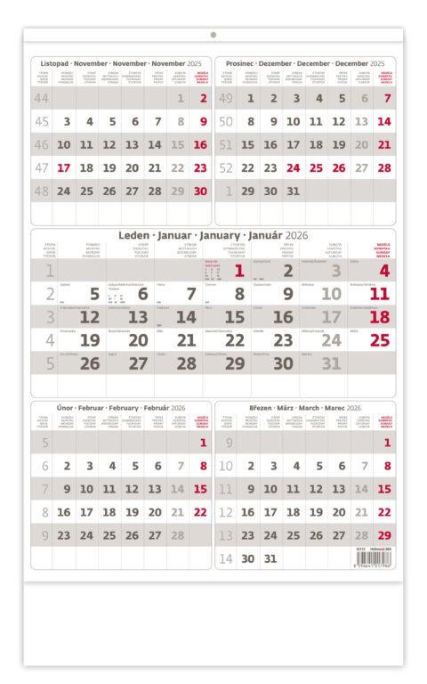 Formát kalendáře: 31,5 x 45 cm Kalendárium: české pětiměsíční jmenné + svátky vybraných evropských států (CZ / SK / A / B / D / F / H / CH / I / PL / RUS / UKR) Rozsah kalendáře: 12 listů Prostor pro přítisk: 31,5 x 7 cm Součástí celého balení je 20 kusů laší zdarma