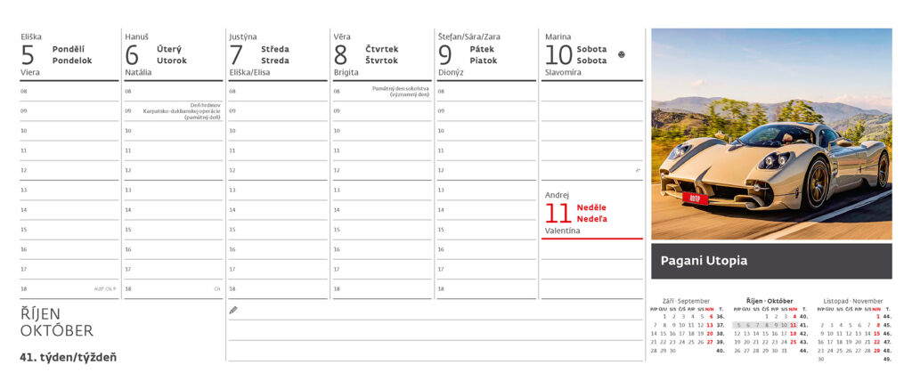 Formát kalendáře: 32,1 x 13,4 cm Kalendárium: české/slovenské týdenní sloupcové Počet stran kalendáře: 60 + 2 Stojánek: se zámkem Prostor pro přítisk: 32,1 x 3,5 cm + roční období, 3měsíční přehled