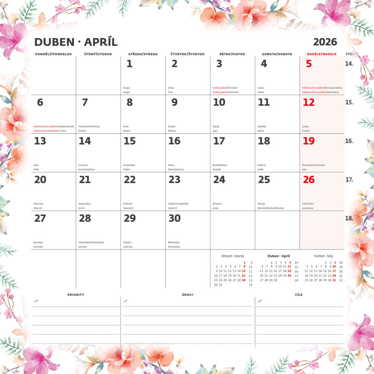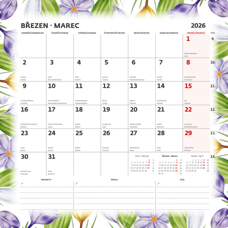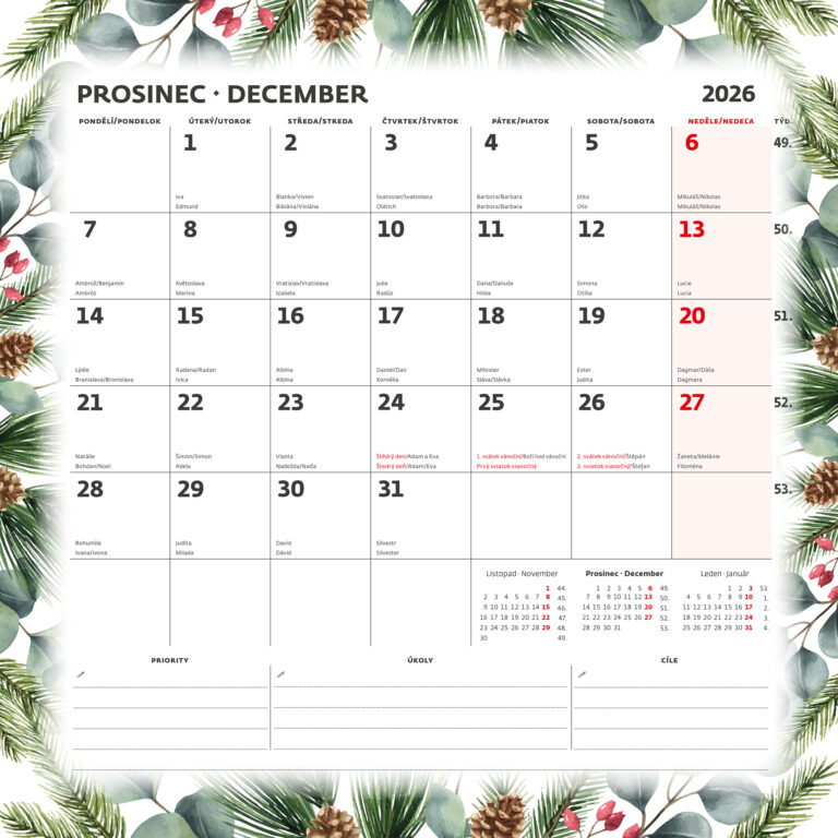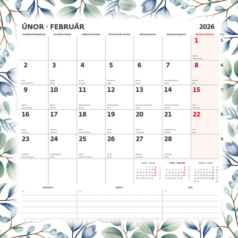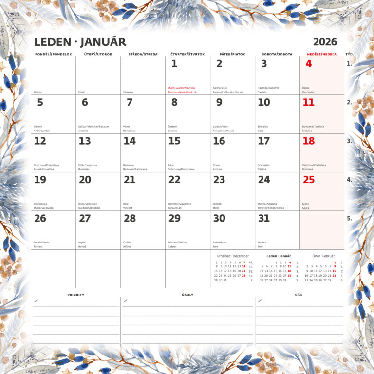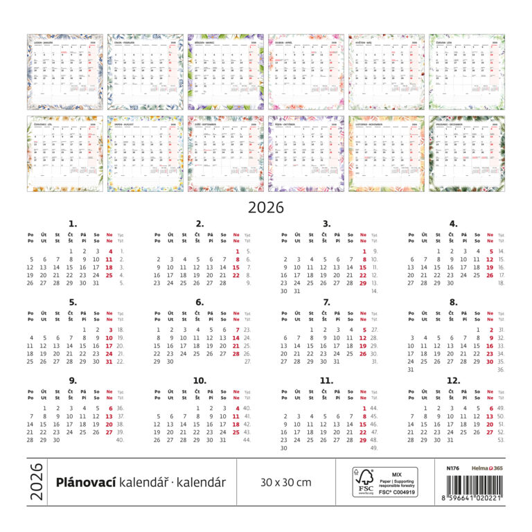 Formát kalendáře: 30 x 30 cm Kalendárium: české/slovenské měsíční jmenné Rozsah kalendáře: 14 listů Vazba: Twin-wire (se spirálou) Prostor pro přítisk: 30 x 7 cm