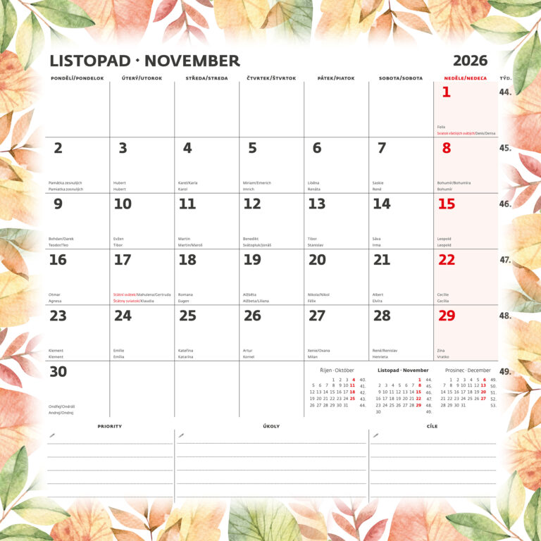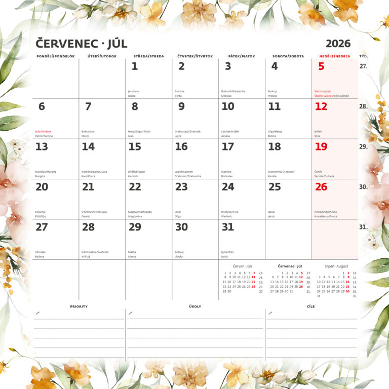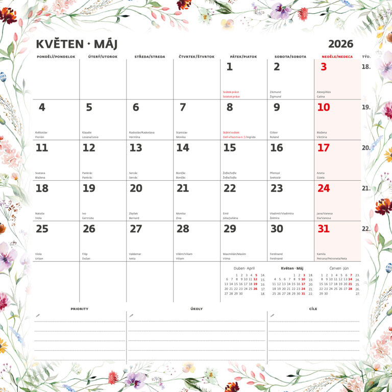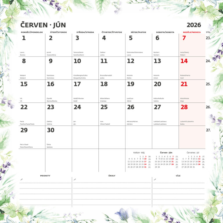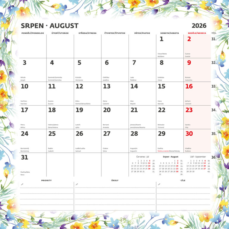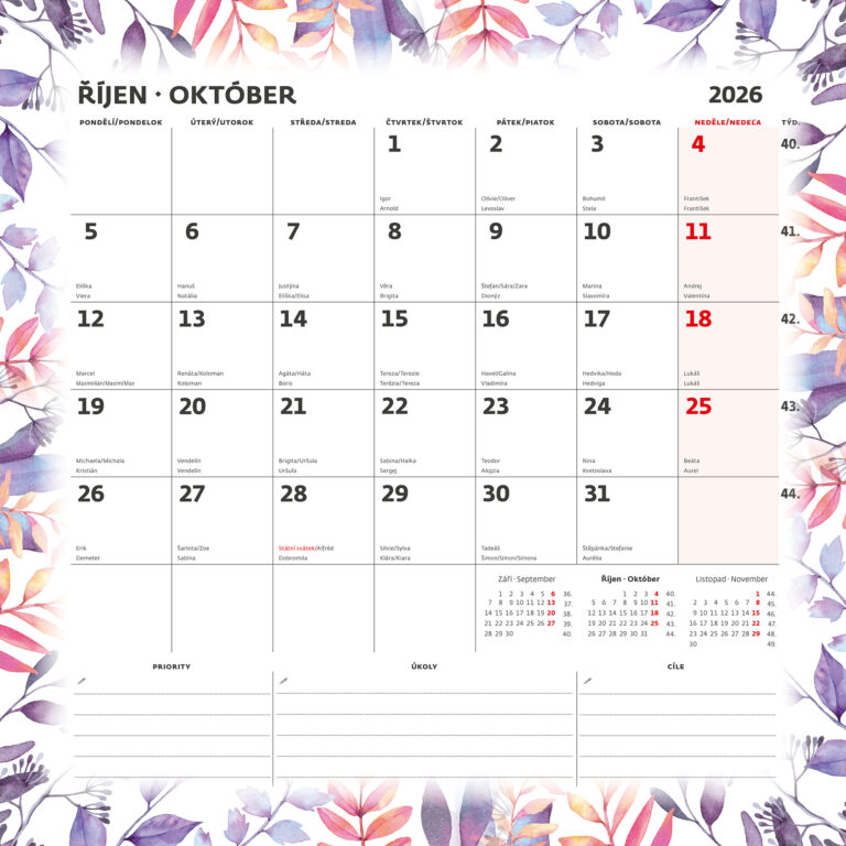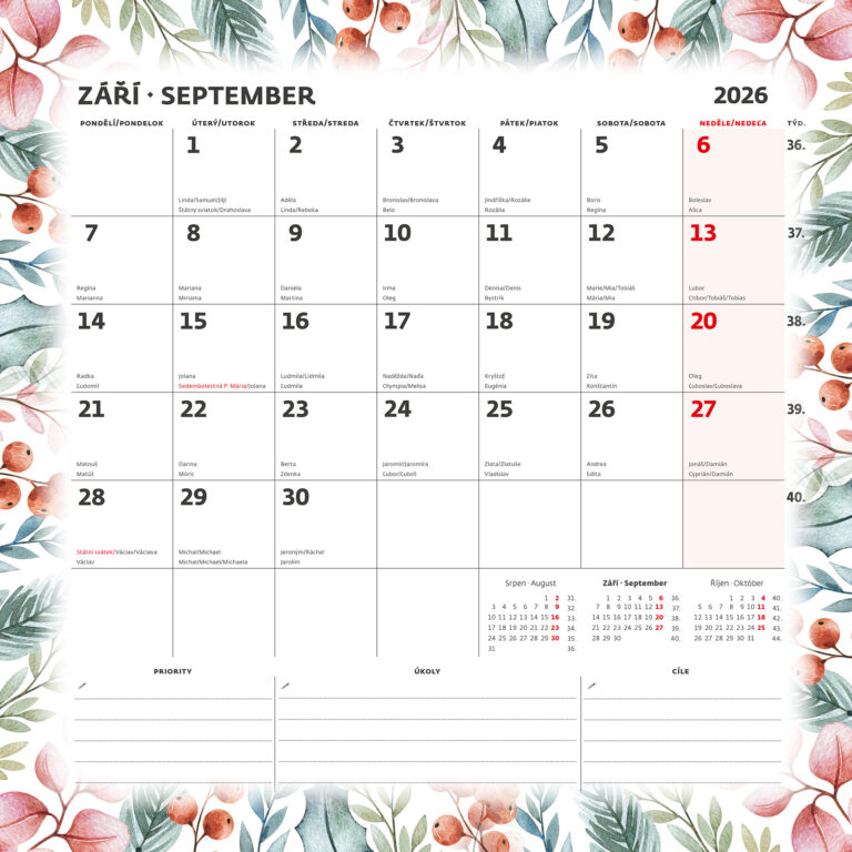 Formát kalendáře: 30 x 30 cm Kalendárium: české/slovenské měsíční jmenné Rozsah kalendáře: 14 listů Vazba: Twin-wire (se spirálou) Prostor pro přítisk: 30 x 7 cm