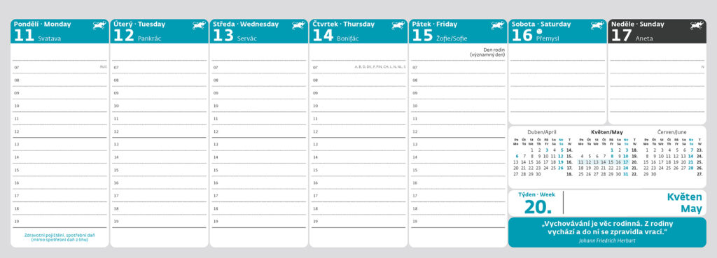 Formát kalendáře: 33,6 x 12,1 cm Kalendárium: české týdenní sloupcové + AJ Počet stran kalendáře: 64 + 2 Stojánek: se zámkem Prostor pro přítisk: 33,6 x 3,5 cm + daně, roční období, znamení zvěrokruhu, citáty, EU svátky, 3měsíční přehled + 4 x praktická záložka