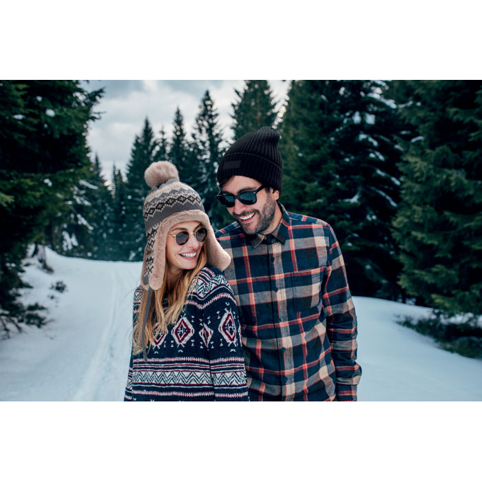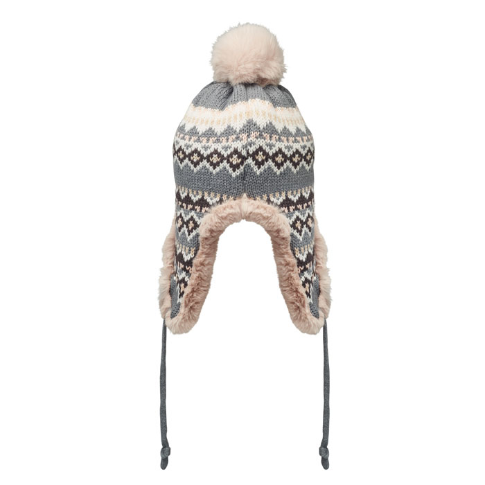 Pletená čepice s klapkami na uši a bambulí z akrylového vlákna s polyesterovou a fleecovou podšívkou. Štítek pro potisk na jedné straně. Velikost pro dospělé.