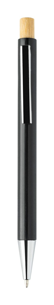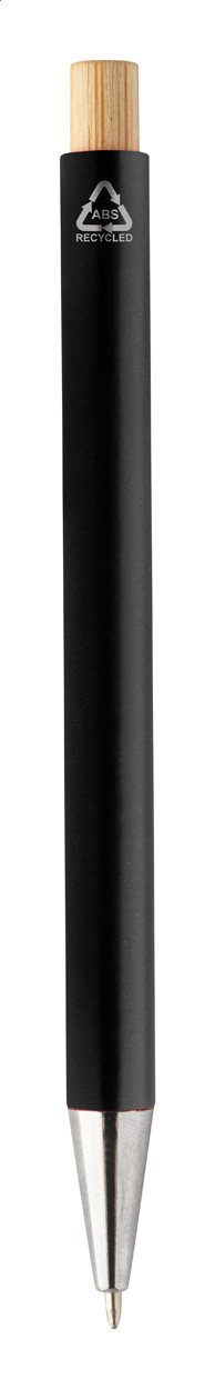 Kuličkové pero z recyklovaného ABS plastu s bambusovým tlačítkem a kovovým klipem. S modrou náplní.
